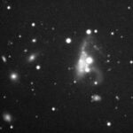 Arp 185 / NGC 6217 | Galaxies with narrow filaments | 2024-05-23 23:56:00 | NGC 6217 is a relatively large and bright barred spiral Arp galaxy, located high in the sky in Ursa Minor. Arp categorizes it as a galaxy with "narrow filaments" and notes in his remarks, "Condensed nucleus. Faint outer arms less curved than inner arms." You know that when the guy with the 200" telescope describes something as "faint", you're in trouble, especially when you're observing on a nearly full-moon night. At the time, I didn't know how to find Arp's remarks so this might have scared me away. However, I was aware of the category, and thought I could see the filaments at capture time. However, in the cold light of day, they're much less evident in the color image than I thought (a common phenomenon in EAA). You can play confirmation-bias with the featured color image and the Arp v color image (2nd in gallery). Fortunately, I've learned that converting a color image to grayscale and inverting it, often helps in this circumstance (first image in gallery). The base of the filament is obvious at the NNW corner of 621 as it exits just above the three bright objects, then takes a wide arc up and to the left (ESE) toward the double-star near the top of the image. The further you go, there's not enough data to resolve it as a "filament", but there's more frequent noise, well above average. Please ignore the faint satellite trail in virtually the same direction. The symmetrical filament out of the SE end of 6217 is much less distinct but still presents a higher noise level. |