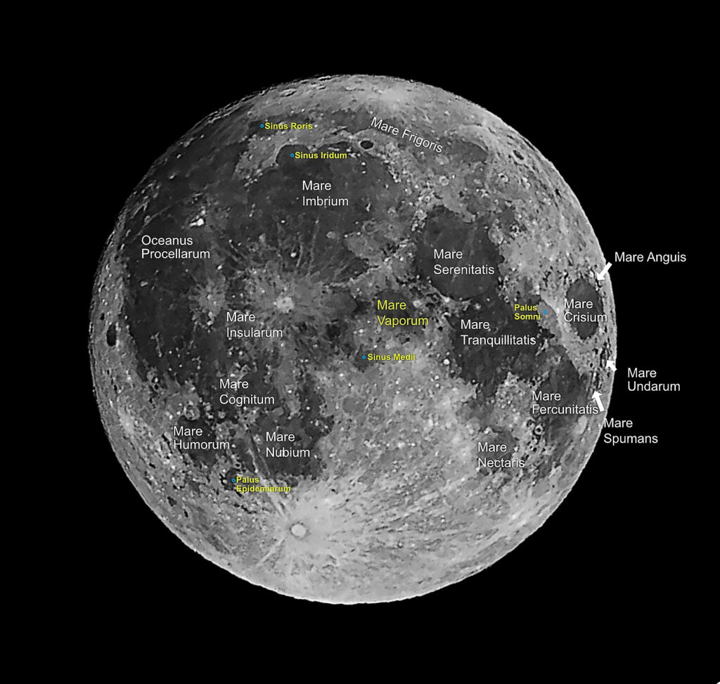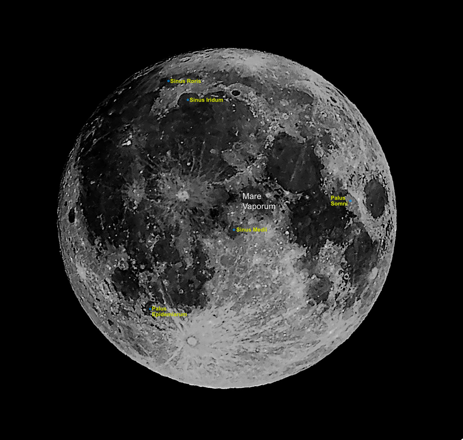Target DescriptionHere are marked six additional objects which can be viewed using binoculars. They include: Mare Vaporum (which makes up the eye socket for the "Woman in the Moon"; Sinus Iridium (Bay of Rainbow) which is shaped like a Rainbow; and Palus Somni (Marsh of Sleep) that seems about as fanciful as any lunar name can be.