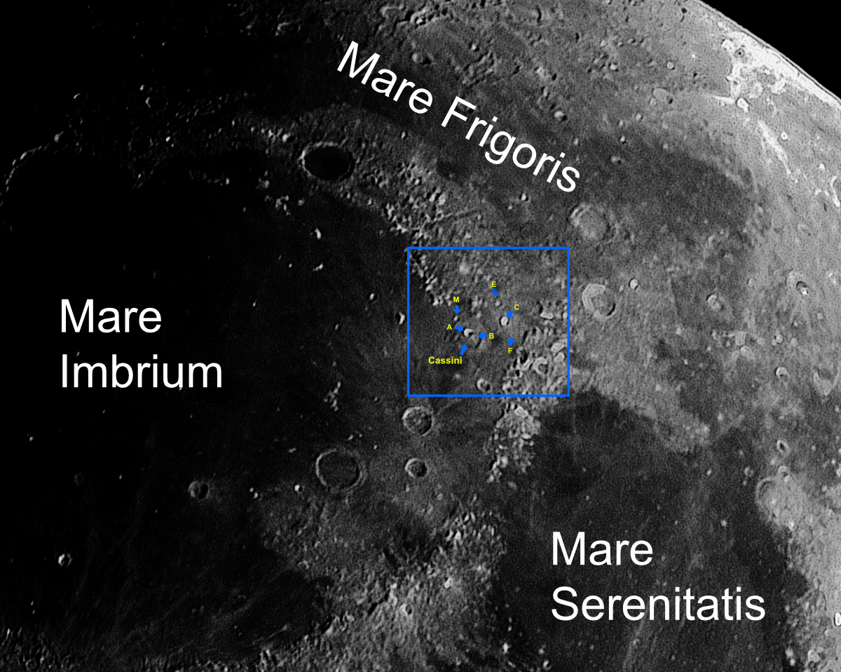 | Target Description | Cassini is a prominent and distinctive impact crater at the eastern end of Mare Imbrium. What makes it distinctive are the many smaller but telescope-visible craters nearby. Cassini A & B are actually within Cassini's rim. M-E-C-F present an arc, NW to NE.. |