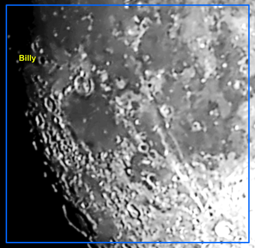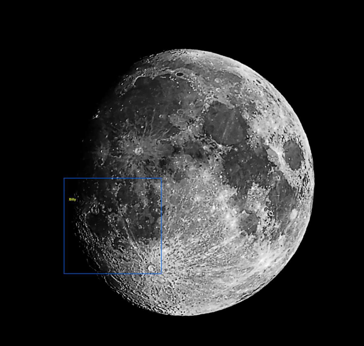 Target DescriptionBilly is relatively easy to locate due to its proximity to the southwest "shore" of Oceanus Procellarum with its distinctive bays and promontories. I found the hooked shape of Dorsa Ruby and Dorsa Ewing useful as confirmation that I had identified the correct object, as well as the distinctive shape of Crater Gassendi.