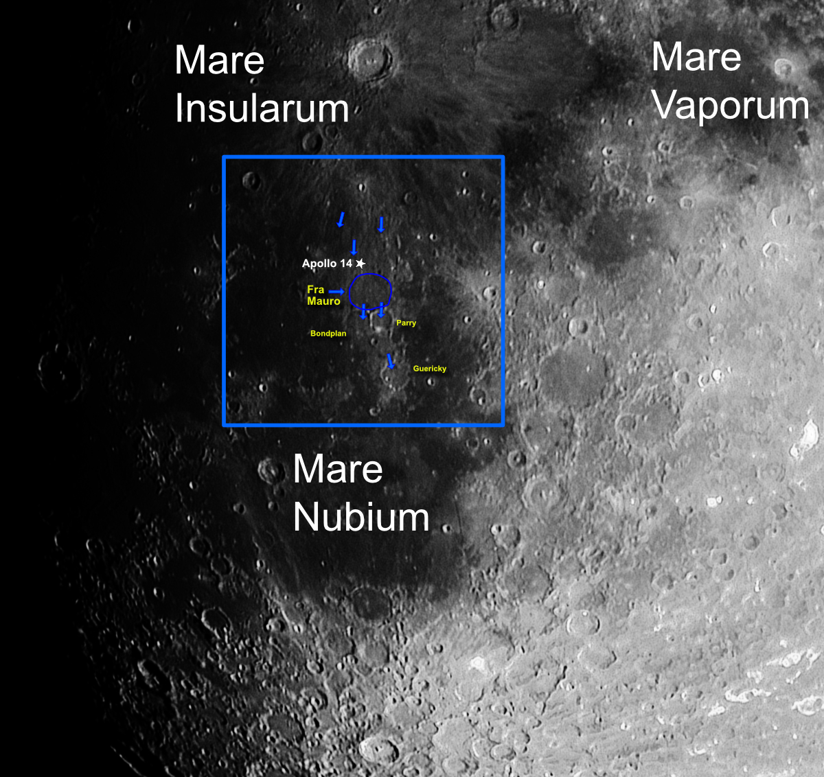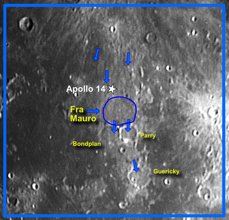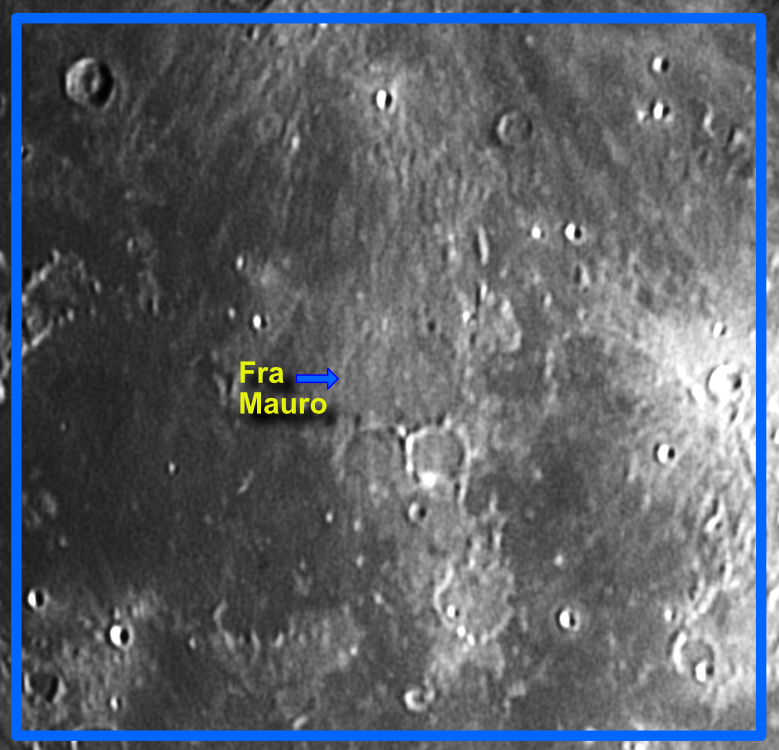 | Target Description | This didn't seem like much, at first. But as I researched it online, I discovered it has a lot to teach me. Fra Mauro itself is barely visible, and mostly filled with the same basalt that fills Mare Insularum. This was originally the landing site for the ill-fated Apollo 13 flight, and it tells me something that NASA reassigned Apollo 14 to land here. Gallery image #2 shows what's come to be known as the "Fra Mauro Complex": it consists of a complicated rille system (suggested by the arrows) provided pathways for volcanic fill to 3 more craters. I learned that Mare Insularum is itself a massive impact crater filled by the melting of the lunar mantle, and filling the Mauro complex as well. |
