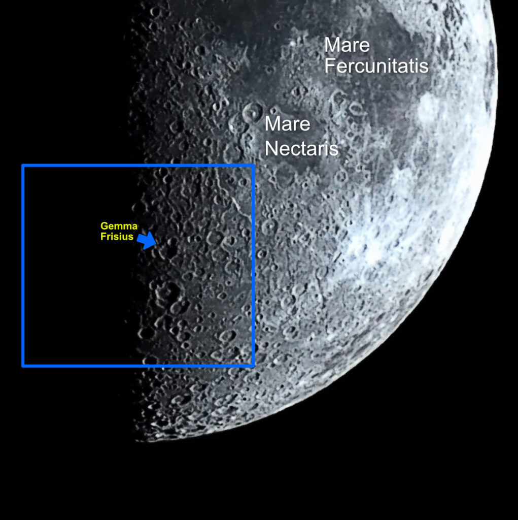 | Target Description | This is a challenging target to find, located as it is in the rugged southern highlands. Many of our other targets are located within or close to a Mare, so they're easy to find in a wide range of light. Here, big parts of the highlands disappear in later light, which makes finding this crater -- located by "crater hopping" -- doubly challenging. To top it off, early in this quest I was trying to locate everything on my 10.5 day capture because it's the highest resolution. And somehow I did manage to locate Gemma. But when it came time to write up the report, I thought it looked ridiculous: even with an arrow pointing right at it, I could barely make out the crater rim. So, I looked for it in my other library captures. I struggled at first with this quarter moon view, and wasn't 100% sure it wasn't in shadow. So I switched to the 8.6d, found it quickly, but still didn't like its appearance. Returned to the quarter moon, and found it by hopping from the Pitiscus/Homel pair in the SE corner of the rectangle. I've provided all 3 views in the gallery, roughly matching the rectangles. |