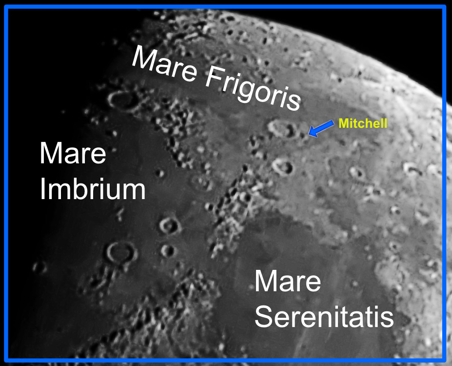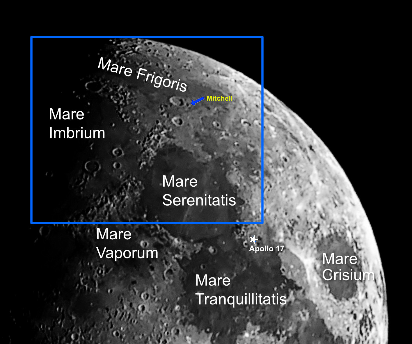 | Target Description | Mitchell is the tiny impact crater on the eastern rim of Aristoteles. It was named after the first female astronomer in the United States, Maria Mitchell. She was the first American scientist to discover a comet: 1847 VI (modern designation C/1847 T1), which made her internationally famous. Additionally, she was an early advocate for science and math education for girls and the first female astronomy professor, teaching at Vassar College. This crater is not visible in my 3.8 day view. Given its categorization as "4 day", I wondered if it could be a hint at the "unofficial" Mitchell crater. This was dedicated by an Apollo 17 astronaut to Billy Mitchell, an early advocate of air power. After a fair amount of work, I concluded it wasn't the target. First, the scale of the unofficial Mitchell was too tiny for any of my telescope views, and smaller than any other telescope object in this program. Also, the Apollo 17 landing site is only slightly east of the official Mitchell, and not visible in my 3.8 day view either. Note the location of the Apollo 17 landing is marked on the second image in the gallery. I've also included a detailed map of the Apollo 17 landing site. Mitchell was not originally labelled, but I inferred its location and marked my guesstimate on that map. |