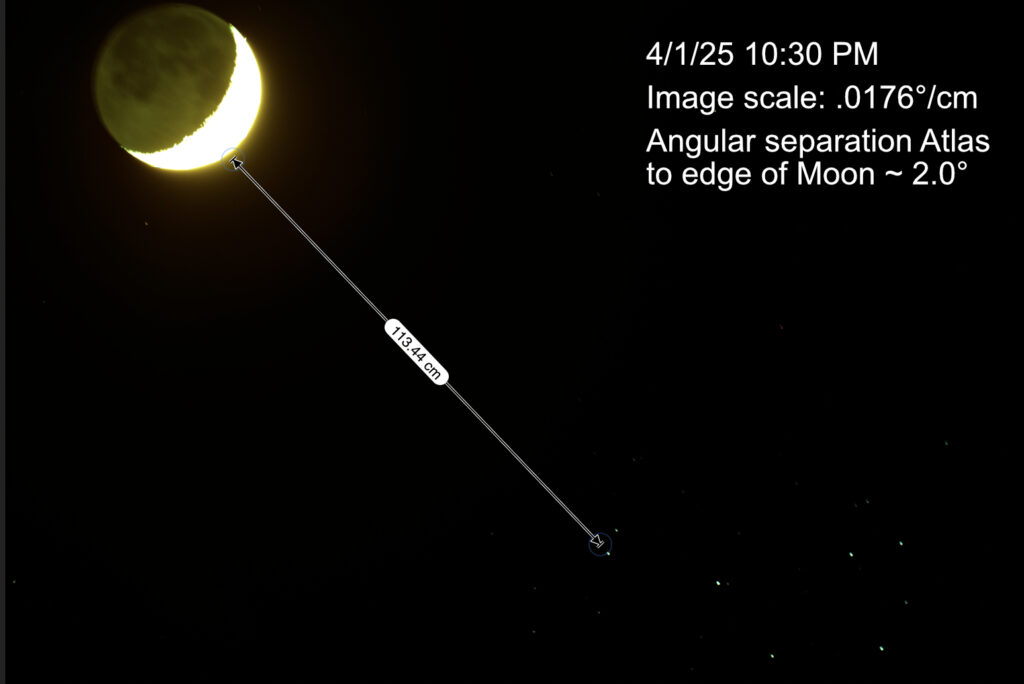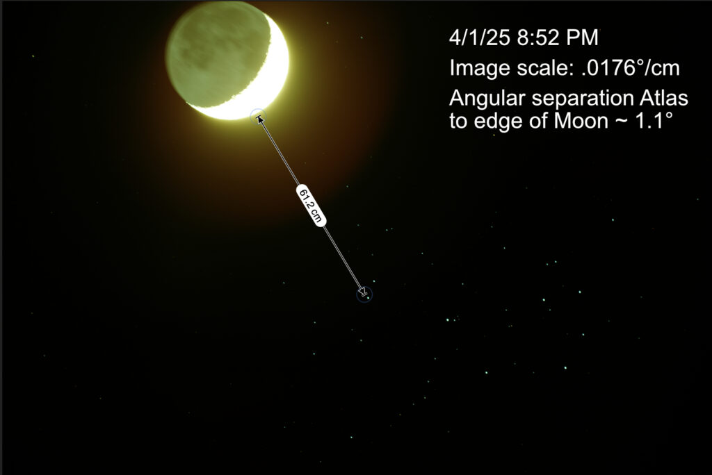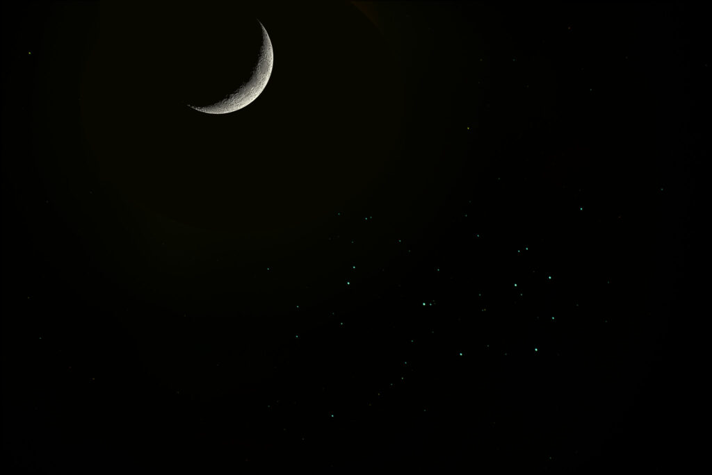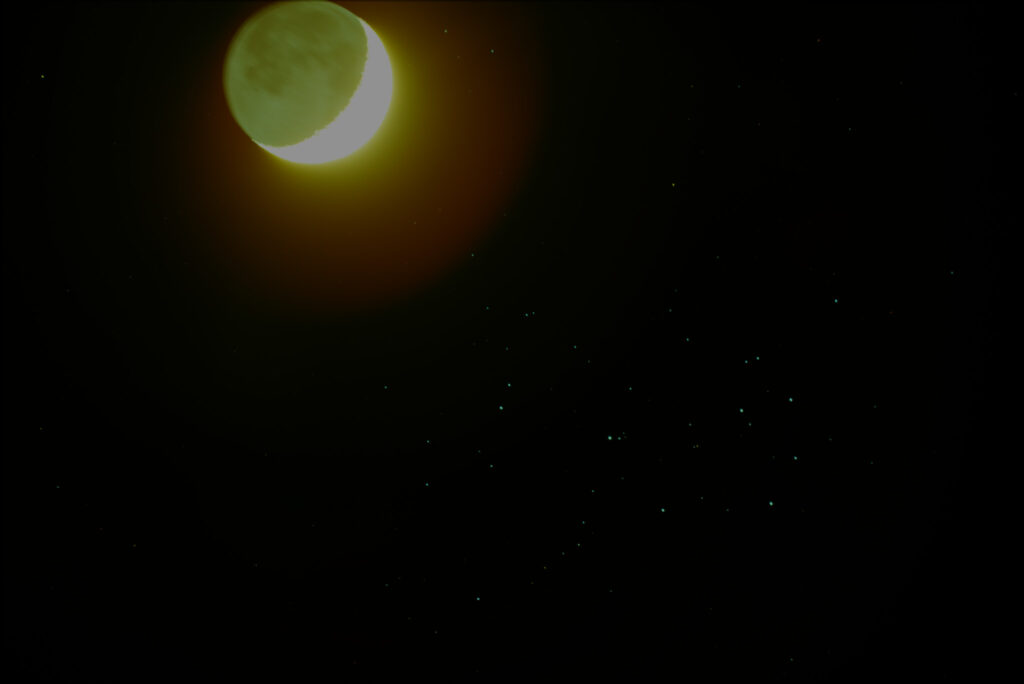 In order to keep both the moon and M45 completely in the frame as their separation grew, I used SharpCap’s click and recenter tool. Note the separation has increased significantly, but both (barely) fit within the frame.