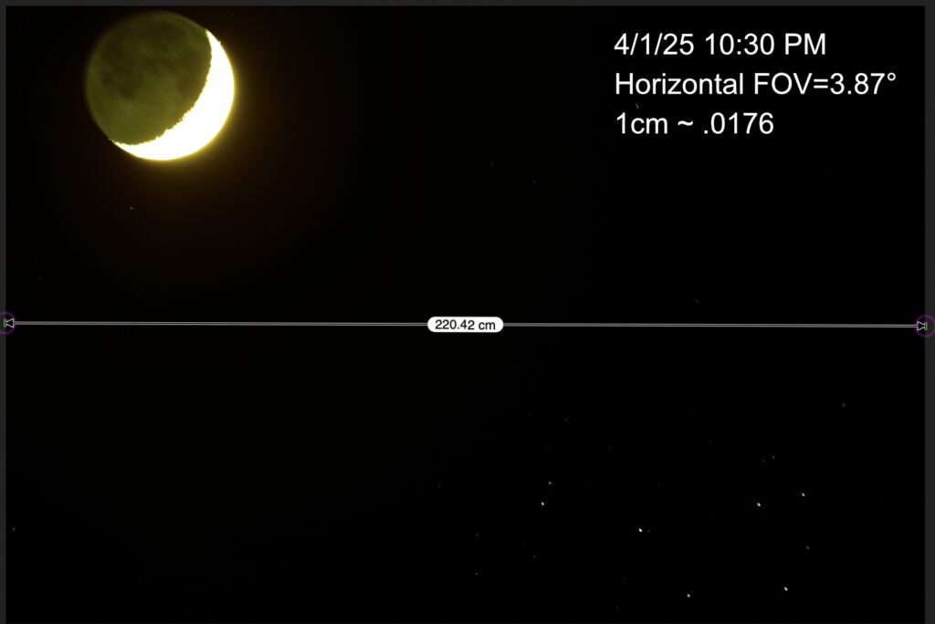 I knew from having entered all of the particulars of this imaging setup in Sky Safari that the full FOV of this telescope and camera was 3.87°. The full image measured 220.42 cm. This translated to 1 cm = 0.0176°.