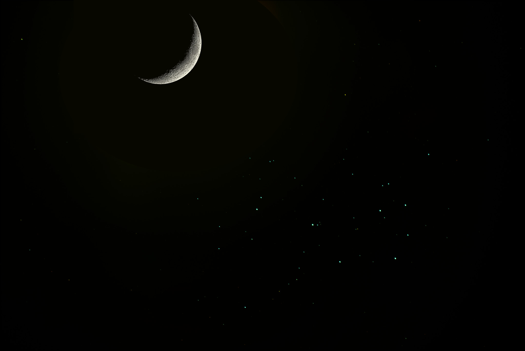On the first clear night after we decided to pursue the Lunar Observation (Imaging) award, we noticed that the 4-day moon was in conjunction with the Pleiades (M45). This seemed like a golden opportunity to fulfill the “Optional” Telescope Object to “Plot the moon’s hourly motion against the stars for two hours or more.”