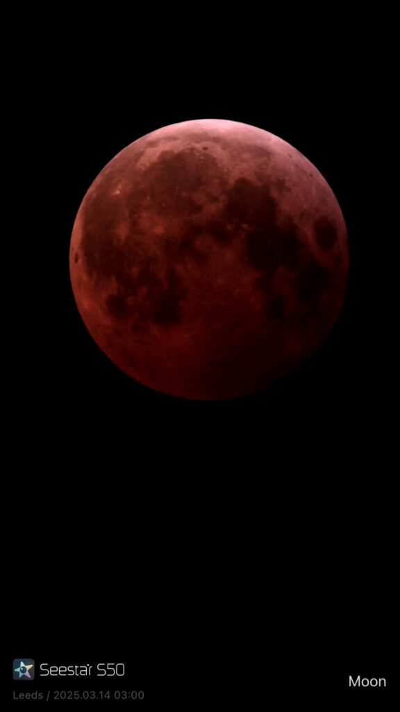 | Image Capture Description | I'd set the alarm when the moon would be nearing totality, and had the Seestar ready to set out. Turned out the imaging session was trickier than normal, as the Seestar's software which will normally point directly at the moon automatically didn't recognize the near-totality eclipse as the moon. I had to point in manually, which I haven't done in a while. Once I got the moon centered, everything went easily. |