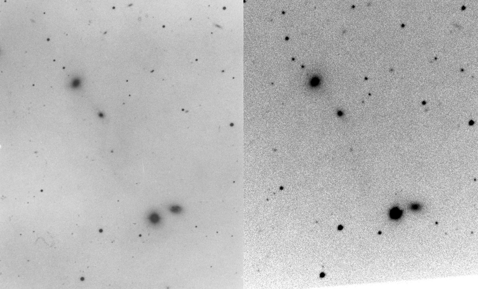DescriptionAt the root of the controversy is whether a tidal connection exists between IC 3481 and 3483. In his observing notes, Arp says the connection goes only "two-thirds of the way". But later images with different telescopes and emulsions made it appear that the connection is complete, and my observation could certainly be interpreted that way (though I wouldn't suggest it's definitive). Most Arp fans thought the connection existed, but then spectroscopic analysis gave 3483 a much lower redshift suggesting it was much closer. Arp argued that redshift measurements were not definitive, and if what you could plainly see was in conflict with theory, believe your eyes. Arp ultimately ultimately developed his theory of "intrinsic redshift" which made him a pariah within the Palomar community... It was one thing to point out peculiar galaxies: it made some Palomar astronomers uncomfortable, but others -- in particular Zwicky -- were strong supporters. However, this disagreement placed Arp in direct opposition to a central principle of Hubble's cosmology -- that redshift was a reliable measure of relative distance due to the expansion of the universe. Arp ultimately lost his observing privileges as a result.