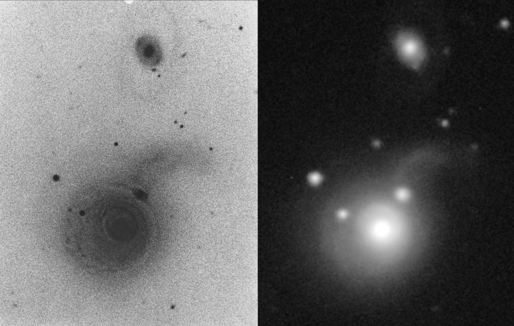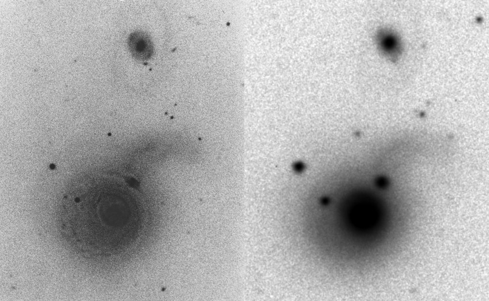 Arp's remarks, "Ring off center, broad ejected plume from condensation in ring," frankly seem to miss the point. It's one of the fun things about observing Arps is that while you always need to take Arp seriously, his interpretations are sometimes wrong, and this seems to be a case of this. I would suggest the plume wasn't ejected, it was left behind in the absorption of 5615, and then potentially made more diffuse via interaction with 5613.
