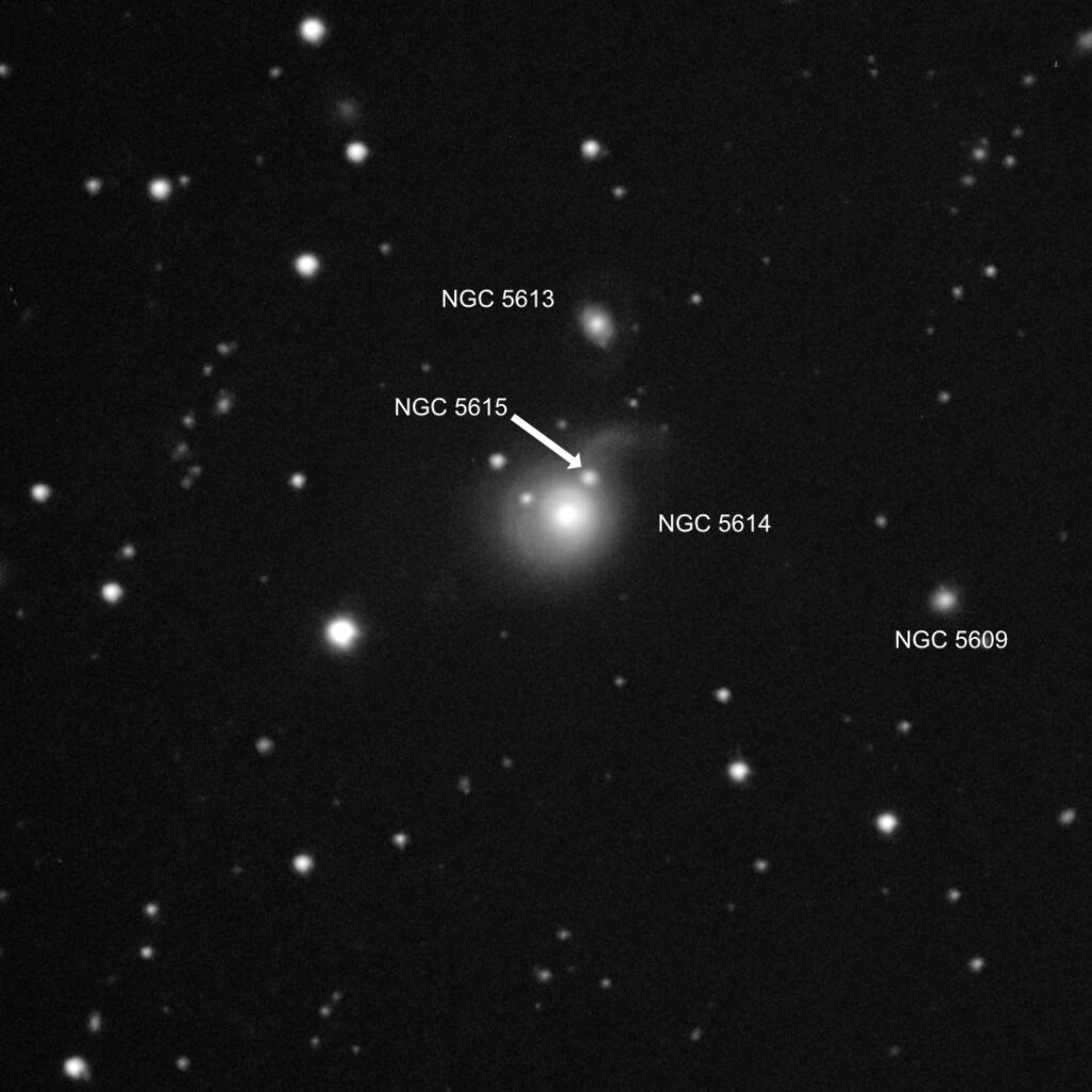 DescriptionThis is a truly enigmatic Arp object. At first glance it appears to be two galaxies interacting: NGC 5614 (the large galaxy) and NGC 5613 (the medium sized galaxy above it). Unfortunately, the giant plume (which is the predominant "peculiar" feature" doesn't make any sense in that context. It starts to make sense when you realize that the spot on the rim of 5614, close to the right hand edge at the base of the plume, is a dwarf spiral in its own right, NGC 5615. Then, especially after some enhancement, my image reveals some structure: a brighter tidal tail the width of NGC 5615 within the larger, much more diffuse plume that appears nearly structureless. In the first instance, it seems like this was formed by detritus left behind when 5615 was ripped out of a likely orbit (R to L).