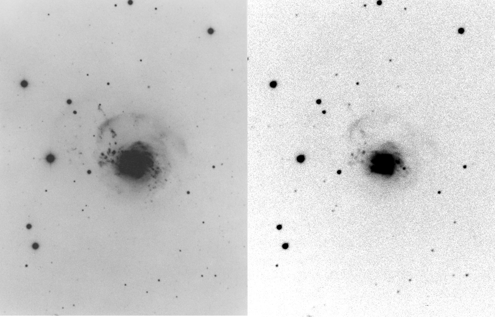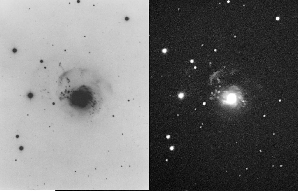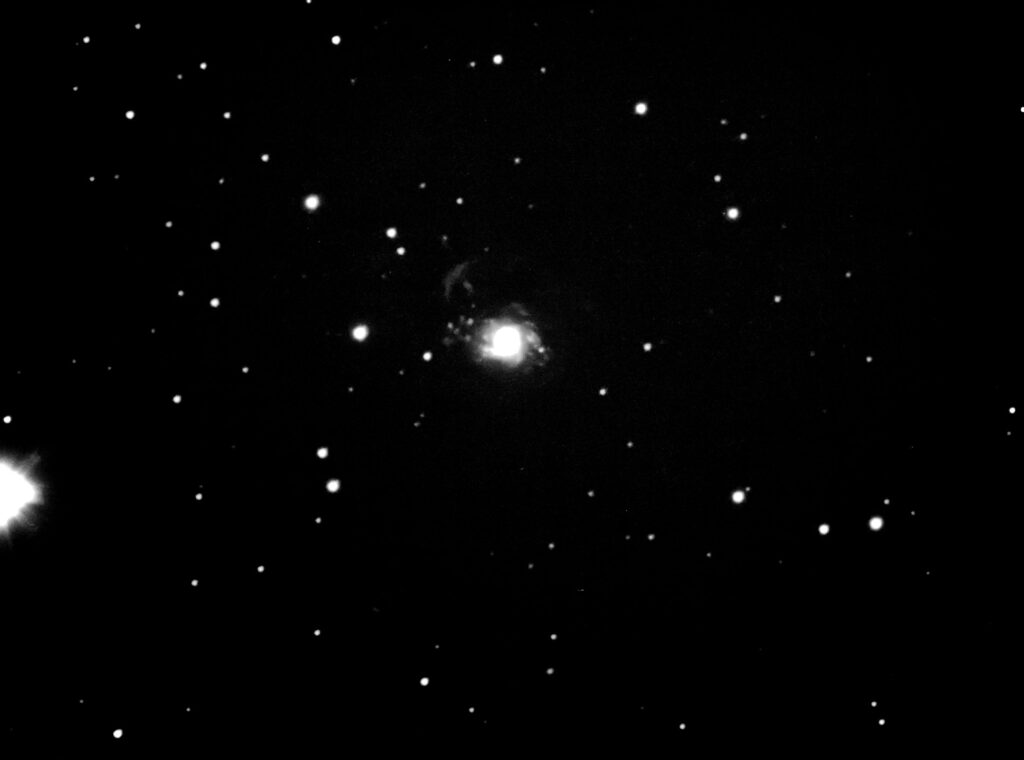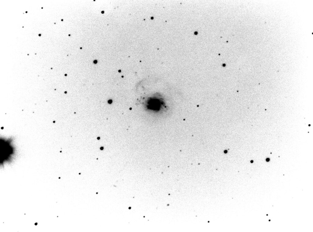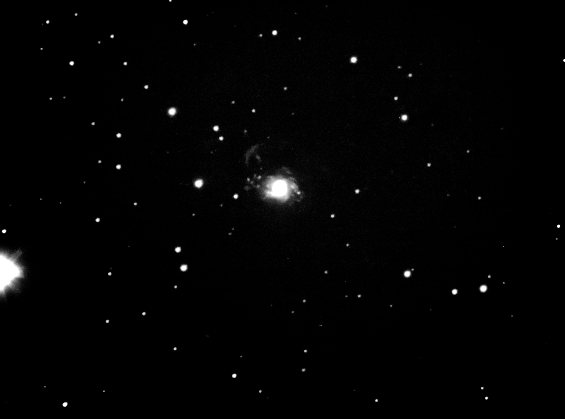 | Description | The first observation following a clear day, but with a full moon. As it turned out clear enough. This has a very bright galactic core, and is another William Herschel discovery from 1789. Arp categorizes this as "Galaxies with adjacent loops", and notes that the main arc (the bow) consists of H-alpha. This is normally associated with start formation, and modern commentators classify this as a post-merger "starburst galaxy". "Starburst galaxies" have a star formation rate at least 10x the Milky Way's. They are often characterized by funky structure, as we see in this case. Note, particularly in the inverted image, there is a pretty convincing arrow crossing the bow towards the left end of the arc. Certainly in my inverted image, it appears that at least two galactic cores abut each other: a big central core, viewed top down and therefore nearly round, and the second, to the upper right, viewed edgewise. There appear to be a set of nodules to the left of the core: star birthing areas? Dwarf galaxies never absorbed? Best viewed in the positive image with some reference to the inverted. All on all, a fascinating set of structures which appear to be the result of disruption. |