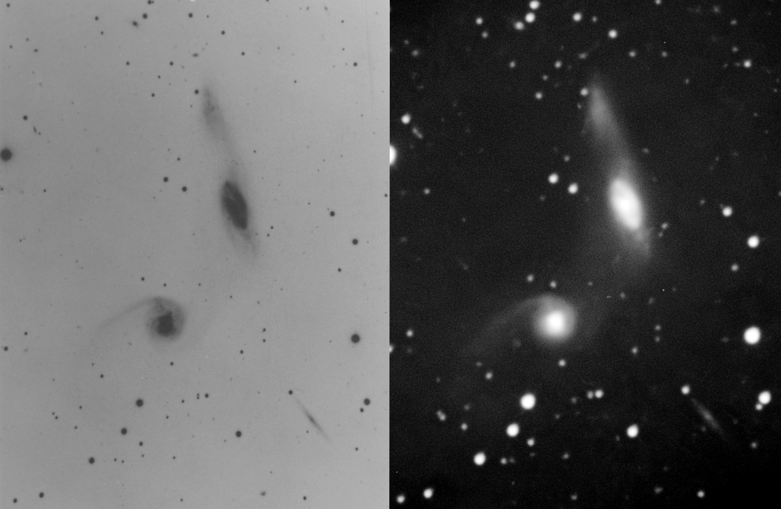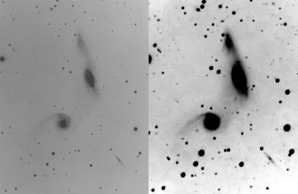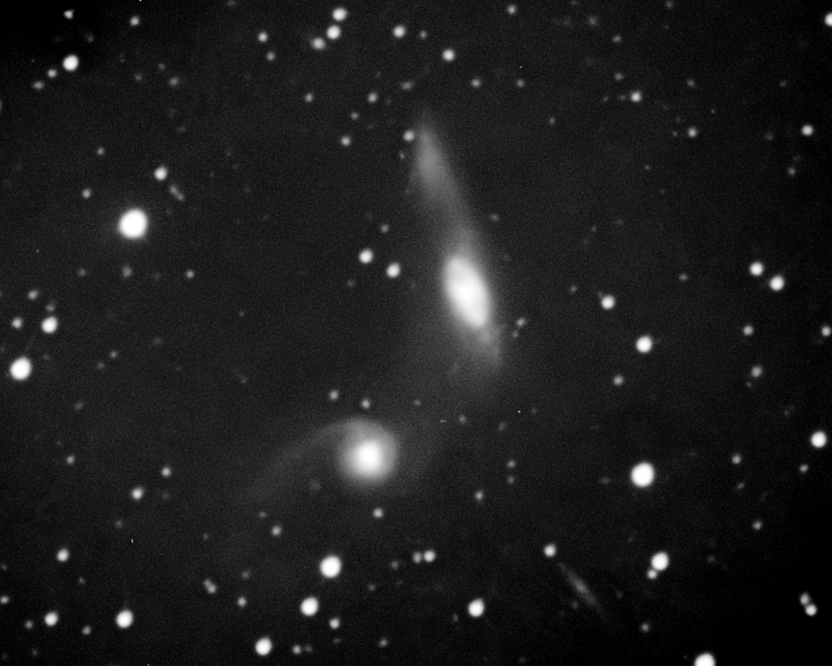 | Description | Another case where my monochrome CMOS camera is capable of capturing a deeper image than Arp's 200" using Emulsion D (the "standard" emulsion). "Very faint diffuse connection from both ends of N spiral to S spiral" aren't so faint in my capture, likely the result of longer wavelength emissions through near-IR. Appearance of fission? Arp abhorred what he called "merger mania" and rarely interpreted interacting galaxies as merging. Still, it appears more likely a merger in process than "fission". Captured on a mediocre evening, cut short due to worsening transparency. My 169th Arp capture, 50% of the Atlas' total. |
