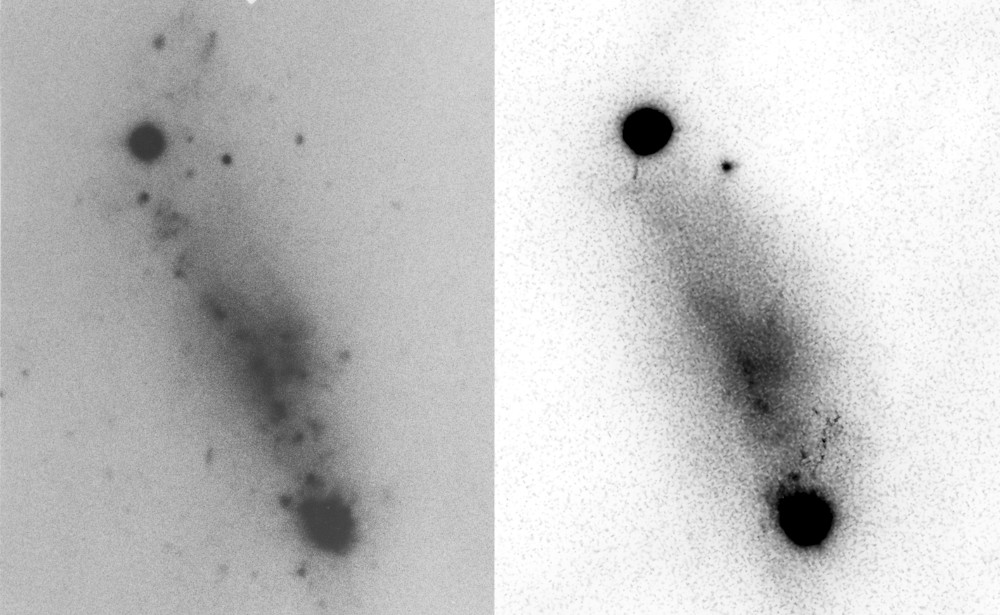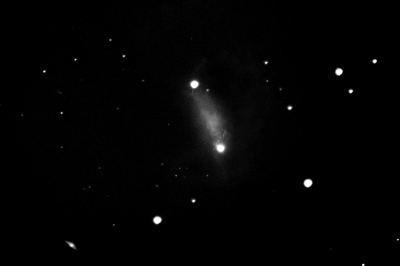 | Description | Even though this galaxy resembles a inchworm, it is profoudly unusual. Note the galactic center is at the bottom of the frame; the bright spot at the other end is a superimposed star. What created such a bizarre shape? I certainly can't say. Even the Hubble image doesn't tell you very much. Captured towards the end of an evening with a 97% illuminated moon, high in the sky |