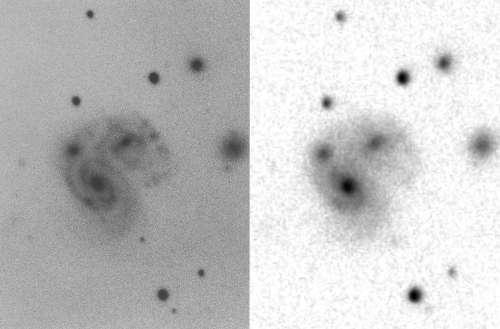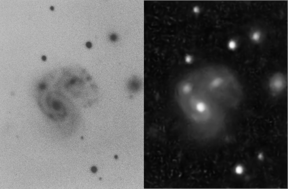 | Description | Arp placed this in the "Double Galaxies - Connected Arms" category. His observing notes added: "Arms join at dense knot or nucleus...." My interpretation from the beginning was that we were really looking at 3 galaxies: NGC 6050 (lower left), IC 1179 (upper right) and a third, smaller galaxy at the end of NGC 6050's arm (upper left). Arp's comment suggests he saw the nucleus but wasn't willing to suggest it's a 3rd galaxy. My research discovered the Hubble image you can find in the gallery which confirms it is a third galaxy. The full image is worth studying as it contains many additional interacting galaxies despite a field of view which is only 0.343° x 0.260°. Note Arp 71 which is the "integral sign" galaxy (interacting with a dwarf galaxy on its "toe") higher on the image directly above Arp 272. Overall, the image captures a significant portion of Abell 2151, the "Hercules Cluster", which contains at least 200 galaxies, many of them interacting. |