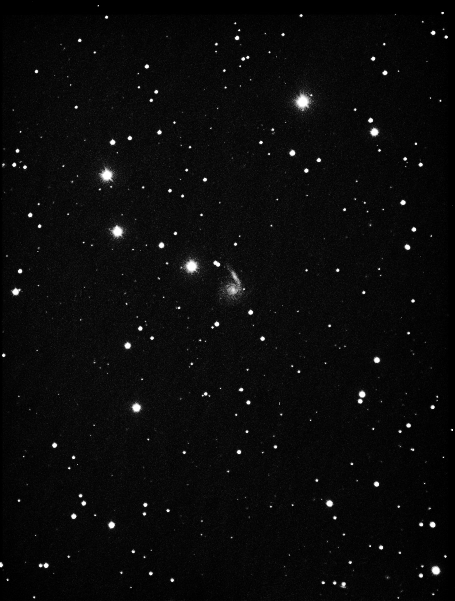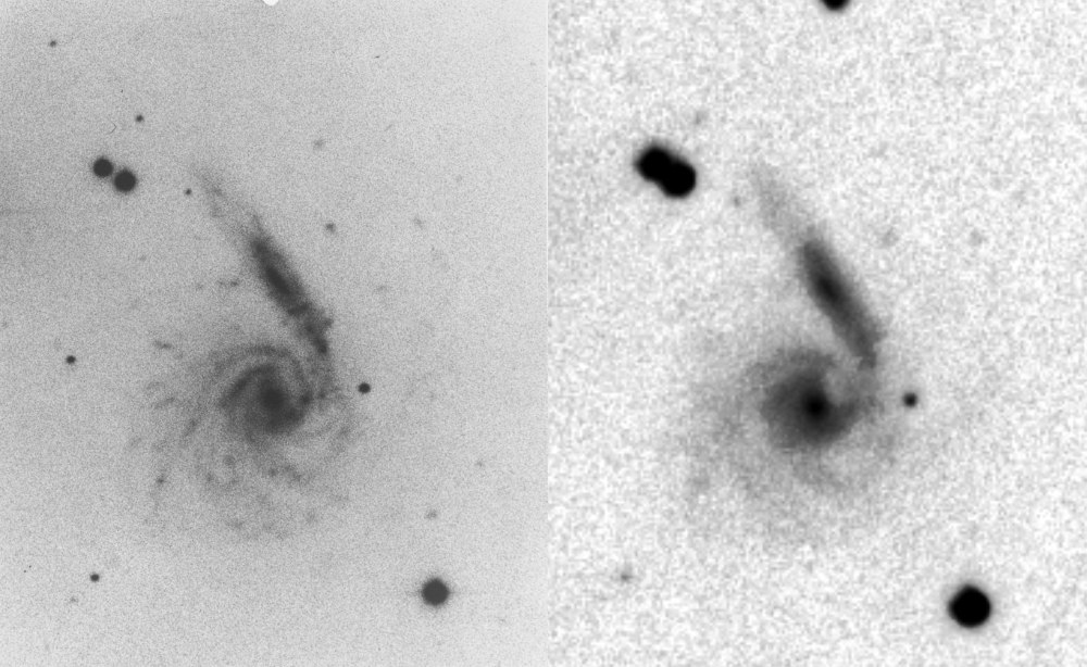 | Description | Arp placed this target in the "Spiral galaxies with one heavy arm". His remarks aren't fully consistent with this category, and state:: "Comp[anion] appears physically connected to flat-on spiral system". My own interpretation is that this is indeed a 2-galaxy system, with the "heavy arm" being an edge on spiral galaxy physically connected to the "flat-on" spiral. The suggests a fascinating aspect of galaxy observing in the mid-1960s. Keep in mind that Arp observed mostly on the 200" Hale Telescope, at the time, the finest instrument in the world. The optics of this telescope are outstanding, but its dependence on manual tracking and a single exposure on film means that its resolving power is only slightly better than my $5000 telescope and CMOS camera. At the time, galaxies mergers were thought to be rare events (if they ever happened), so Arp was clearly reluctant to list yet another "bright companion on arm" and instead keeps it in the Atlas as a "heavy arm". |