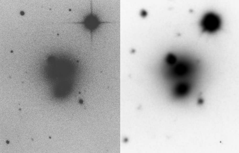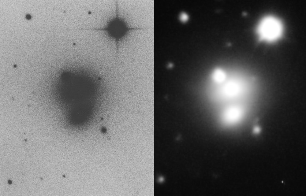 DescriptionArp describes this object as "Very close E galaxies". Famously brief, I'm guessing he's interpreting the 3 nuclei as each belonging to separate galaxies, though I would venture a more common description today might be, "3 merged -- or merging -- galaxies where the nuclei are still distinct". Note Arp remarks further: " Picture is 10X [magnification] of following (No. 311) area".