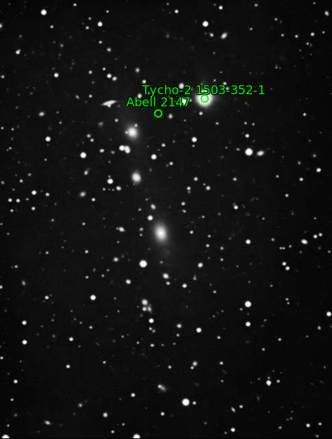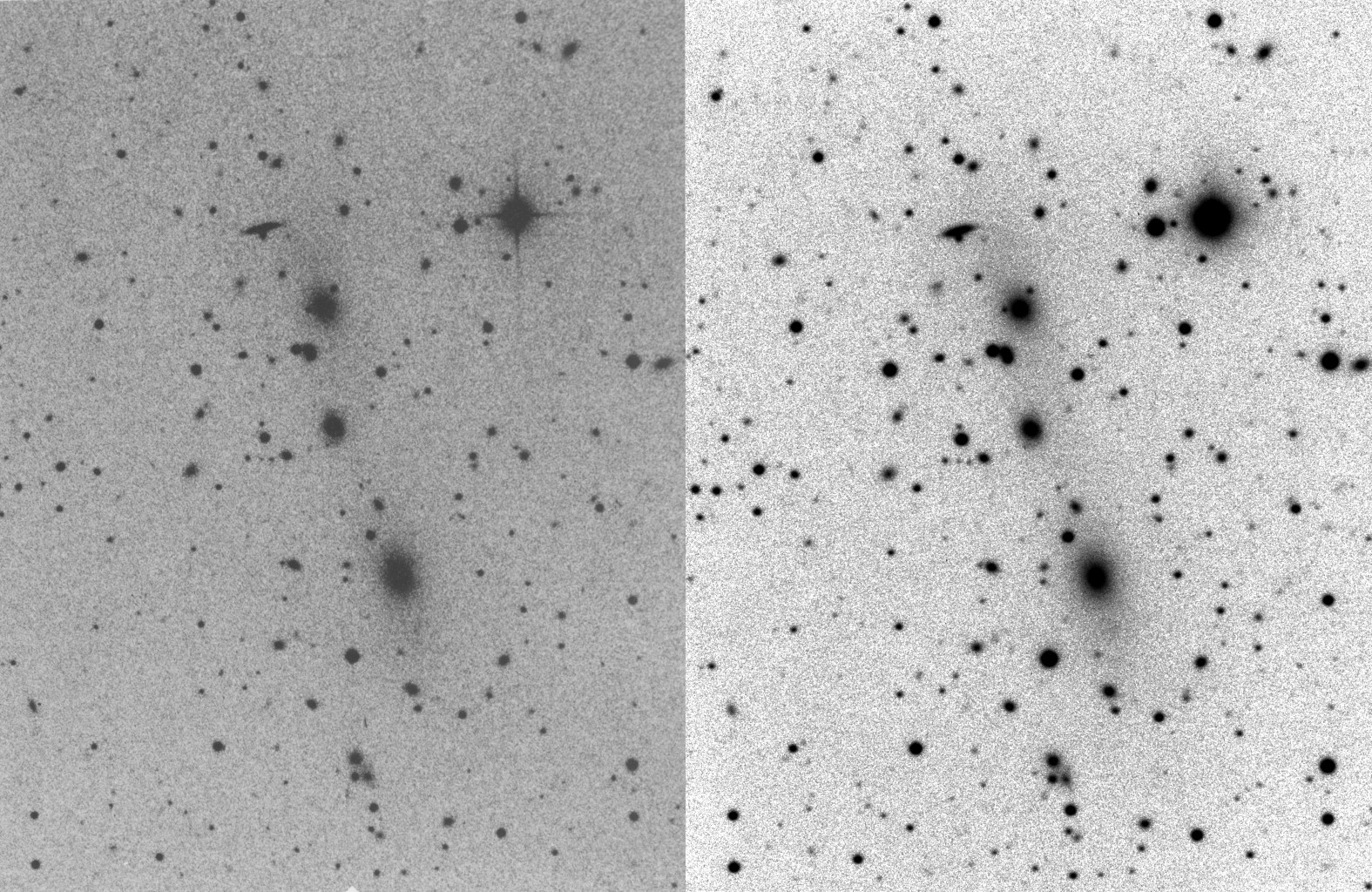 | Description | Arp comments: "Diffuse elongation of E[liptical Galaxy]'s along line joining them." This is pretty evident in both Arp's plate (probably from the POSS survey and taken with the 48" Schmidt telescope rather than the 200" Hale). Interesting that Arp is posting a subset of Abell 2147. George Abell was a Ph.D. student at CalTech who created the Abell catalog as part of his Ph.D. thesis relying on the POSS survey for data. This was Zwicky's big project during this time. The survey was published in 6 volumes just prior to the Atlas of Peculiar Galaxies being published. Abell identified several thousand galaxy clusters within the survey, and his list (expanded later to include the southern hemisphere) is well remembered and a frequent target source for amateur astronomers. |