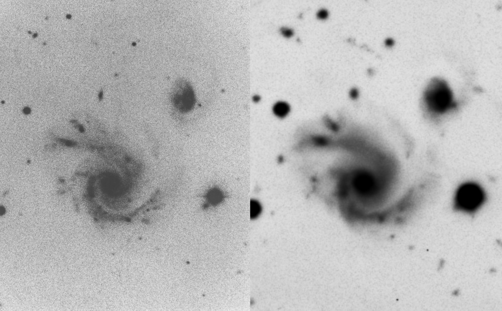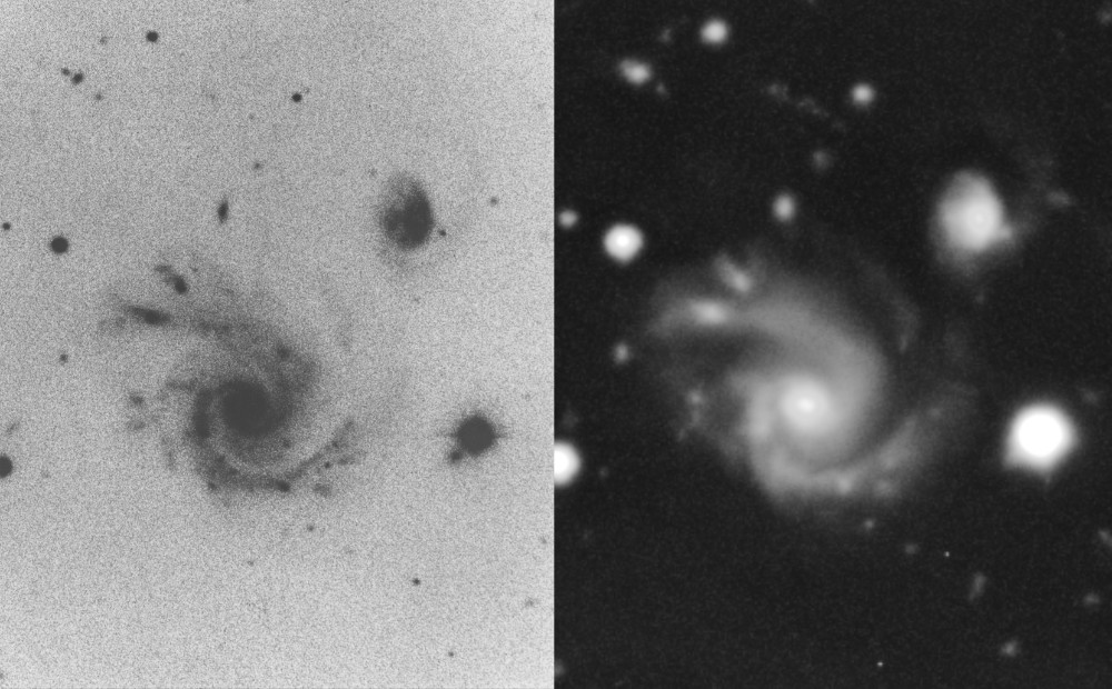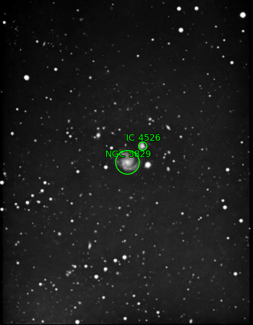 | Description | Arp clearly felt these two galaxies are interacting. He left, for him, a verbose set of remarks: "Faint bifurcated arm to companion, one faint arm on companion coiled same direction as parent". Why he felt it was important that the companion was coiled in the same direction is unstated. And, of course, reading this before observing, a key objective for me was to make sure my observation captured the "faint arm" on the companion. That turned out to be very challenging. The arm is truly faint, and I saw NOTHING until about 50 minutes into the observation, which is an enormous amount of integration given the sensitivity of the Apollo M-mini camera. In this presentaiton you're seeing the image after additional processing, so it may not seem so obscure. I, of course, was planning to continue collecting lights as long as necessary, but clouds put an end to that dream. If you believe red shifts (Arp didn't always), IC 4526 is more than 300 million light years further than NGC 5829, so the appearance of interaction is likely an illusion. NGC 5829 is not, however, one of the galaxies Arp uses to debunk the reliability of redshift as a distance measurement in his book, "Seeing Red". |