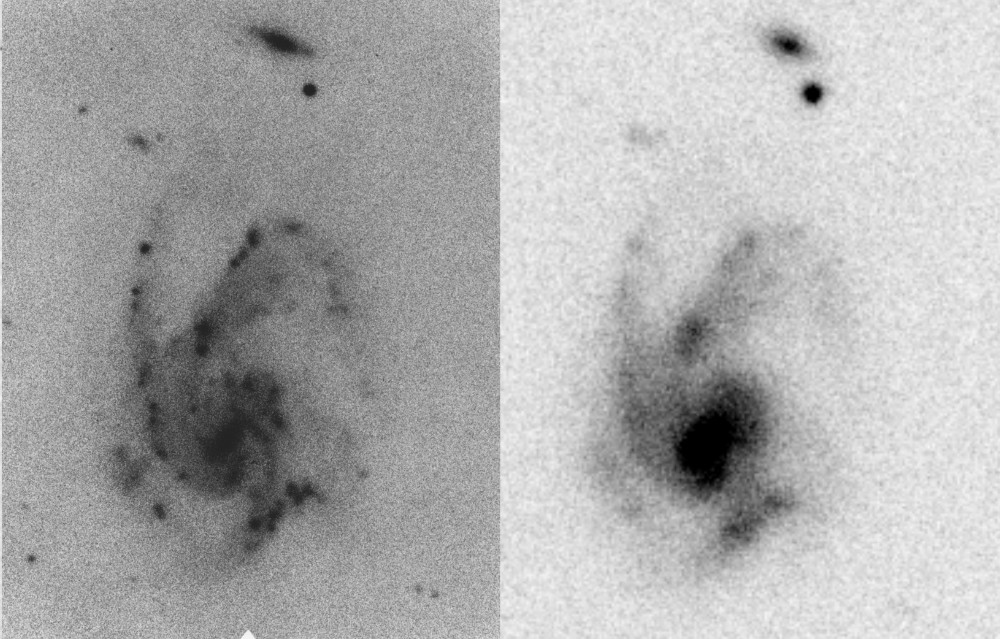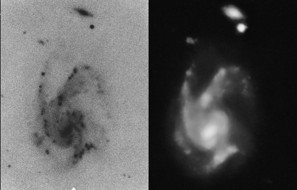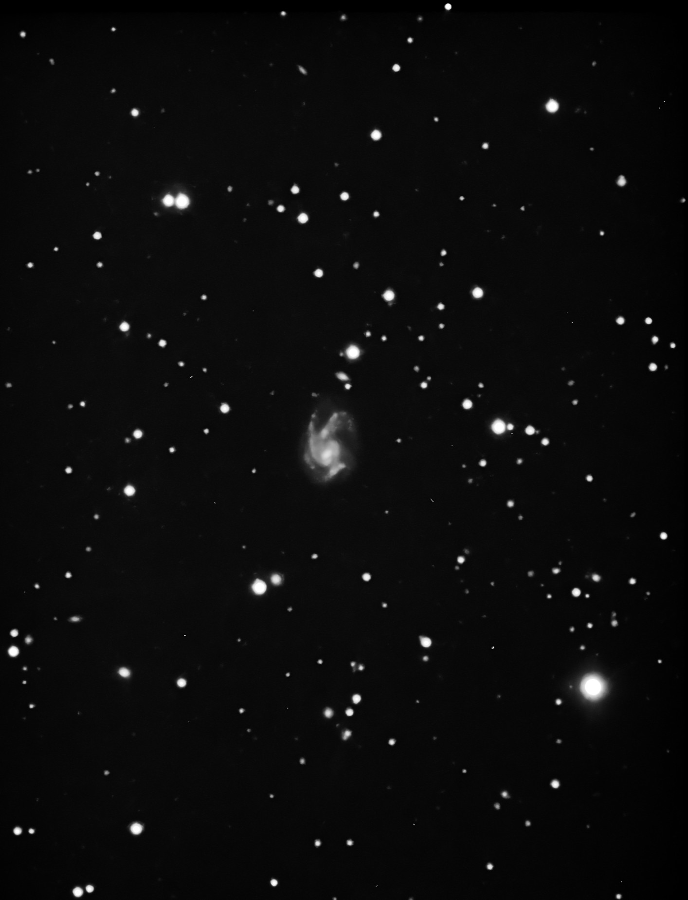 | Description | Arp's remarks are simply, "Three-armed spiral." The classification identifies small, high surface brightness companion on arms. That could be the small spiral you see towards the top of the comparison images. It's the only obvious candidate, for a distinct companion, but it could also be any of several bright knots attached to NGC 5579 itself. In any event, this is a heavily disturbed spiral galaxy.. While the theories of spiral galaxy formation are still squishy, even now, 3-armed galaxies are rare and thought to be a product of a disturbance. What disturbed Arp 69 is tough to say, so the multiple "hot spots" suggest the possibility of an prior interaction, mostly absorbed. |