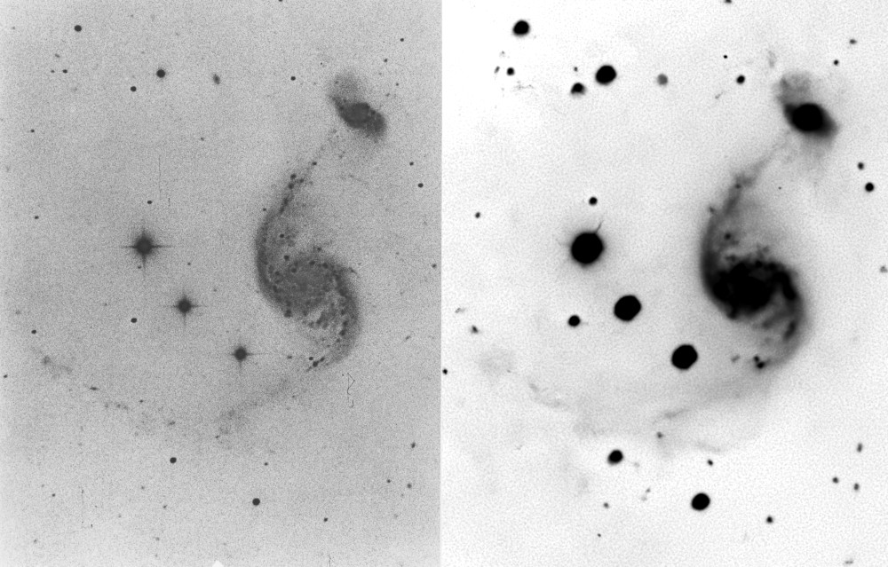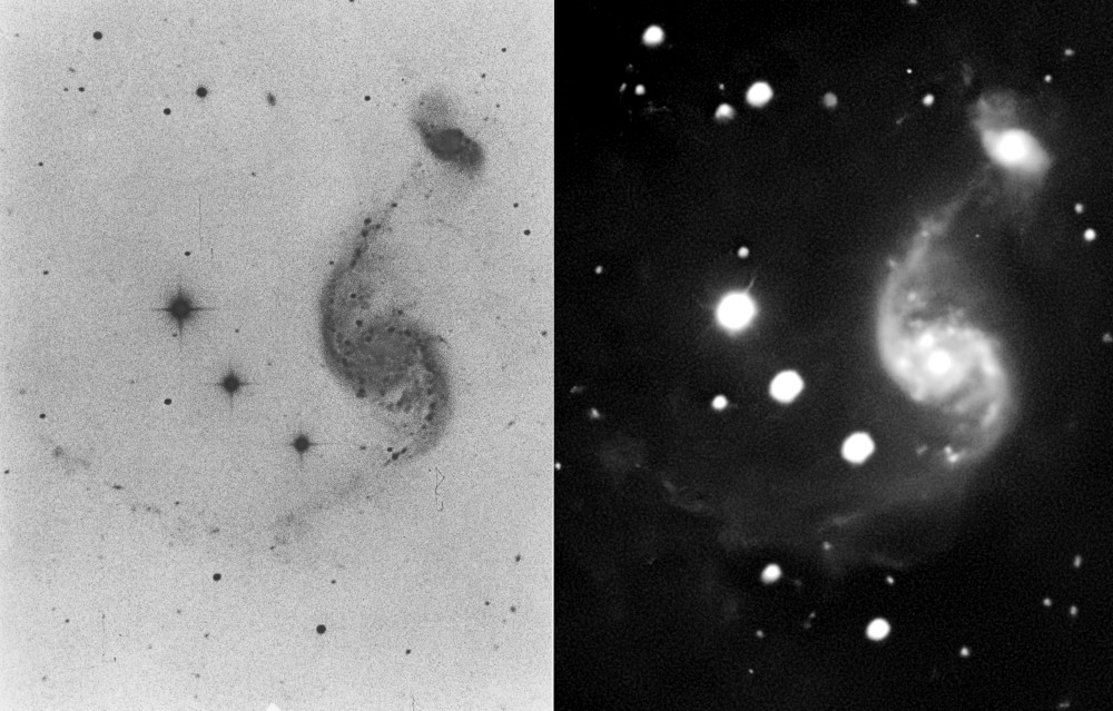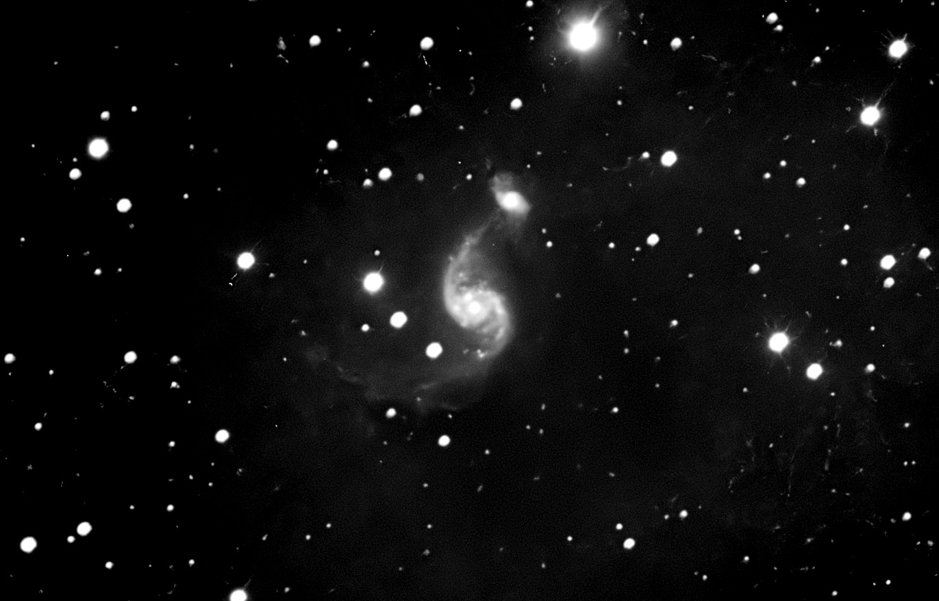 | Description | On the surface this seems like an M51 clone; then you look closer and see a long tidal tail emanating from NGC 2535. Arp remarks: "Arm opposite comp. extremely long." Recent studies have suggested that the "long arm" was caused by a close fly-by, and that the two galaxies are in the middle of a second pass. The interactions stimulated new star formation. Cut short because the full moon was getting higher, and I didn't think additional integration time would help much. |