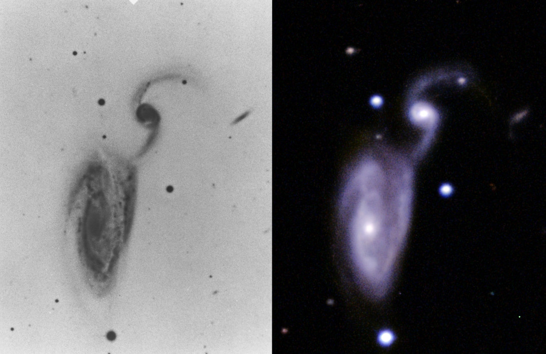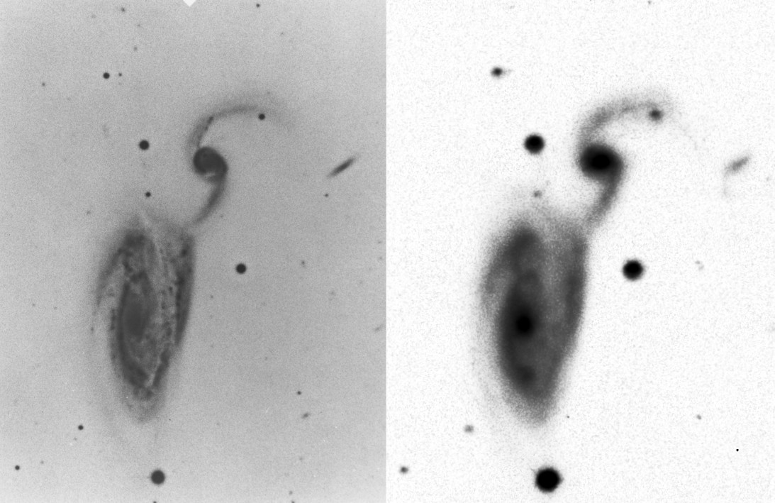 | Description | Finally a dark, moonless night to observe these galaxies. NGC 5395 is a near classic spiral galaxy only slightly distorted by its interaction with NGC 5394, which is an extreme barred spiral. Lovely. It certainly looks like a merger, or at least a strip of stars by 5395 from 5394, which presumably explains the barred spiral configuraiton. Often we see these galaxies by themselves: not often we get to see the theft in progress. It also appears, especially in my inverted image, that there is interaction between 5394 and a tiny galaxy down and right on the image, connected by a faint filament. IC 4356 is also nearby, but does not appear to be interacting with the other three. The nickname Heron Galaxies is apt, though I don't see it widely used. Arp's remarks, "Arcs of high S.B. around nucleus of companion" is certainly evident, and represents further confirmation of the "high surface brightness" classification. Anyway, a fun capture on a dark night. |