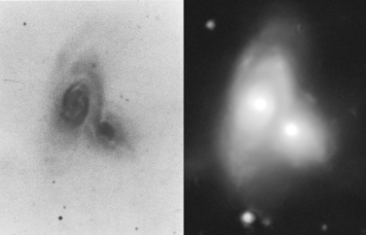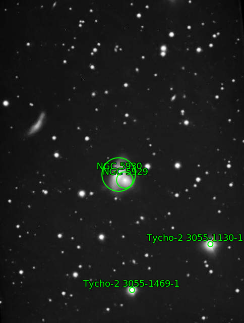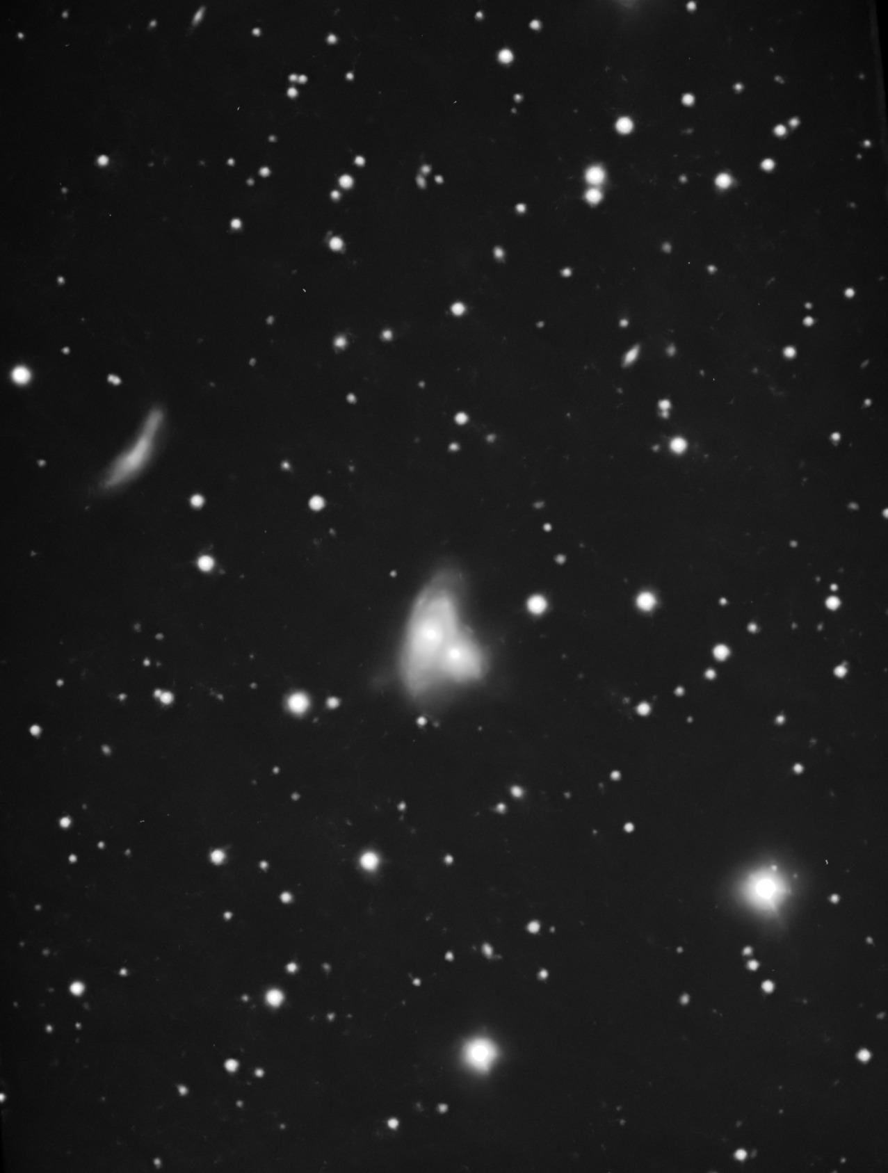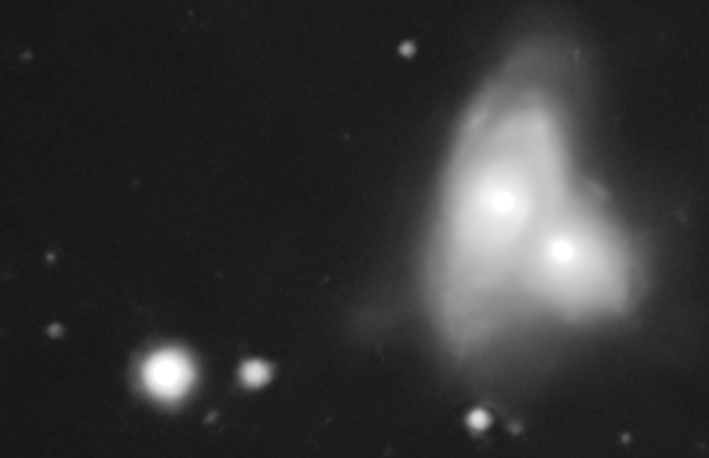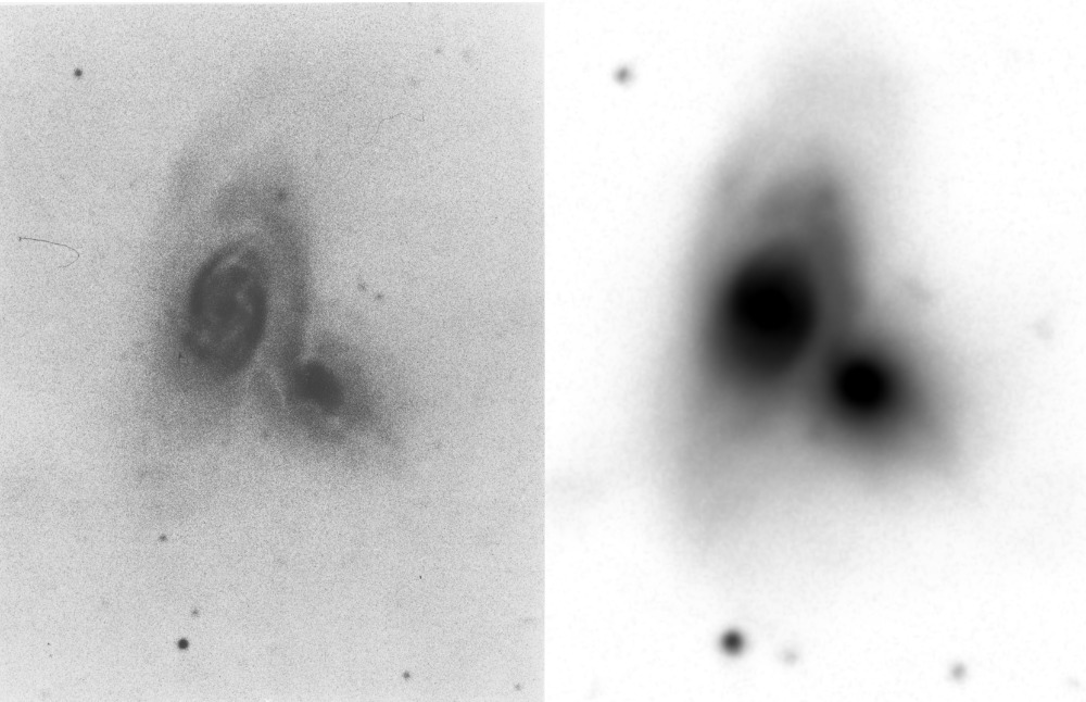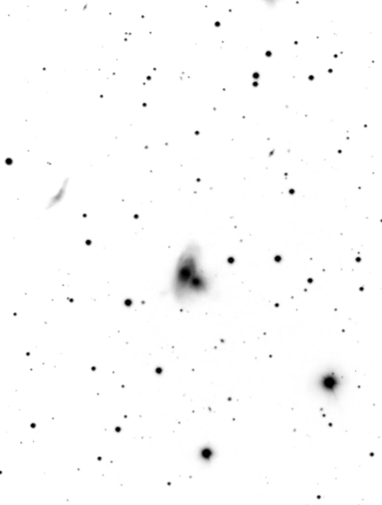 | Description | Arp categorizes this galaxy "doublet" as, "Spiral galaxies with large high surface brightness companions on arms". In this case, NGC 5930 (left) is the "spiral galaxy" and 5929 (right) is the bright companion. Arp's recorded remarks include this notation: "Absorption lanes around companion." I interpret this to mean the dark "arm" (in the inverted images) extending down from the top and along the right quarter of 5930's nucleus and effectively surrounding 5929's nucleus. Arp is suggesting that matter is being exchanged between the two of them. Obviously, some sort of strong interaction is taking place. Whether a merger is the ultimate result, or 5929 will emerge as an independent galaxy is unclear. Today, 5930 is classified as a "Starburst" galaxy, one that is unusually active in birthing new stars. Such activity is stimulated by a merger or near-merger, so consistent with the interaction with 5929. 5929 is today classified as a type 2 Seyfert Galaxy, exhibiting a bi-polar radio jet. Today we recognize they contain Active Galactic Nuclei (AGN), centered on supermassive black holes. In the early 1960s, when the Atlas was published, Seyfert was just beginning to publish his work on these galaxies, and black holes were thought not to exist. I do think that Arp missed an important feature of these galaxies, which is what appears to be a tidal tail on the lower left of 5930. It is most visible in my images, especially the positive one. It does appear minimally in Arp's plate. A tidal tail like this suggests 5929 is passing through 5930 from the lower left. |