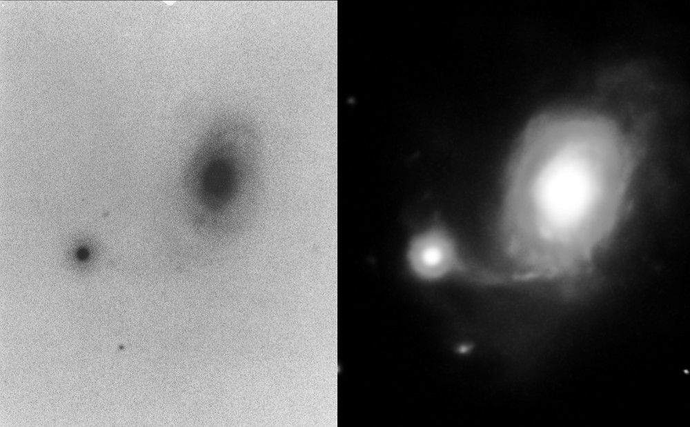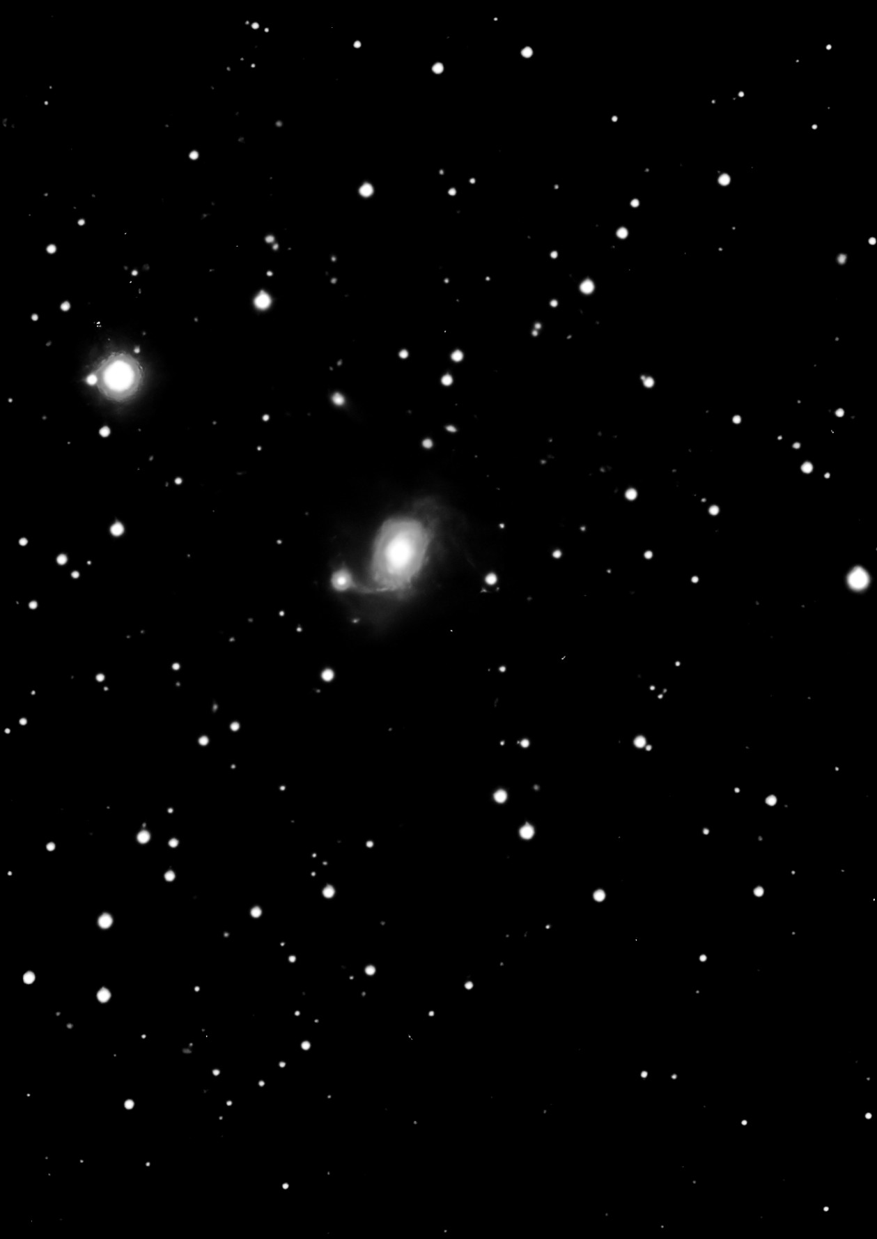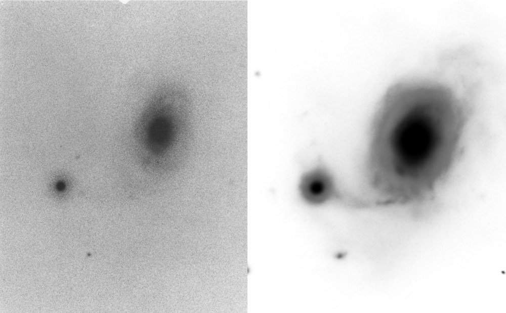 | Description | This target was captured on a dark night, with only so-so seeing. I was hoping to capture the target with both quasars visible. In the event, my captures only hint at them (In fairness, Arp's original only hinted at them).. This galaxy is one which Arp chose to present in a 2004 documentary. There he discusses the issues discovered by two young, Spanish astronomers who observed the target in 2001 and whose final results were published in a respected, European, peer-reviewed journal in 2004. The 2001 observations showed the two quasars located in the filament connecting the two galaxies. I find it highly unlikely these could all be accidents. The documentary included Margaret and Geoffrey Burbidge supporting Arp, which counts for a lot in my book as they are extremely credible. |