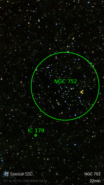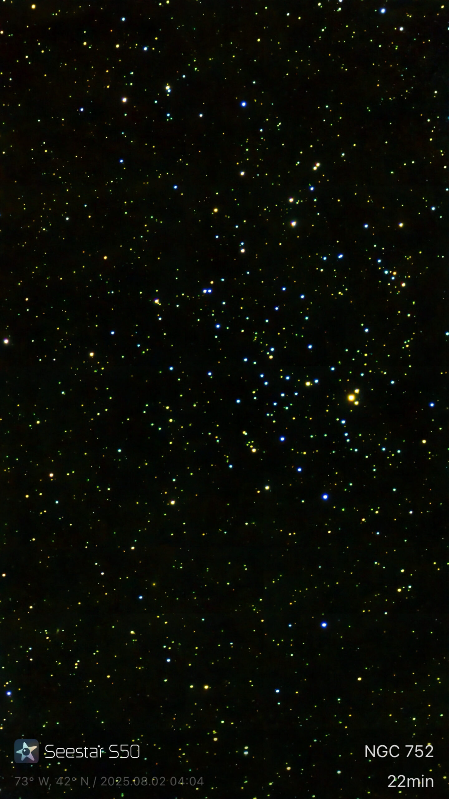 | Image Details | Up is 79.5 degrees E of N. Transparency: Good. Seeing: Good. Total integration time was 22. Exposures 10s. Used Seestar framing feature to broaden FOV, AI Noise Reduction. |