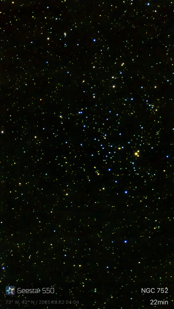 | Description | A charming, large cluster discovered by Caroline Herschel in 1783. Captured on a lovely, mid-summer morning when I woke up early and decided to put out the Seestar. |