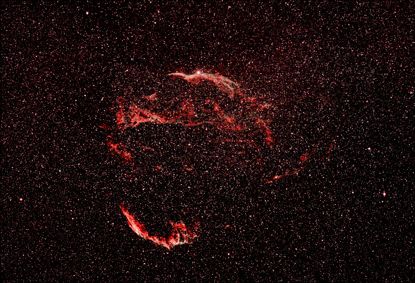 | Description | The Veil nebula is a legendary target and I've always felt my earlier captures didn't do it justice. This took advantage of a transparent but full moon night on a windy evening to capture a widefield view. Framed in NINA. Processed in Affinity Photo... This is a view of the entire Veil Nebula, which I prefer anyway. The western is roughly 2/3 of the image. The Easter Veil is the bright segment at the bottom of the loop, which is covered separately in another observation. |
