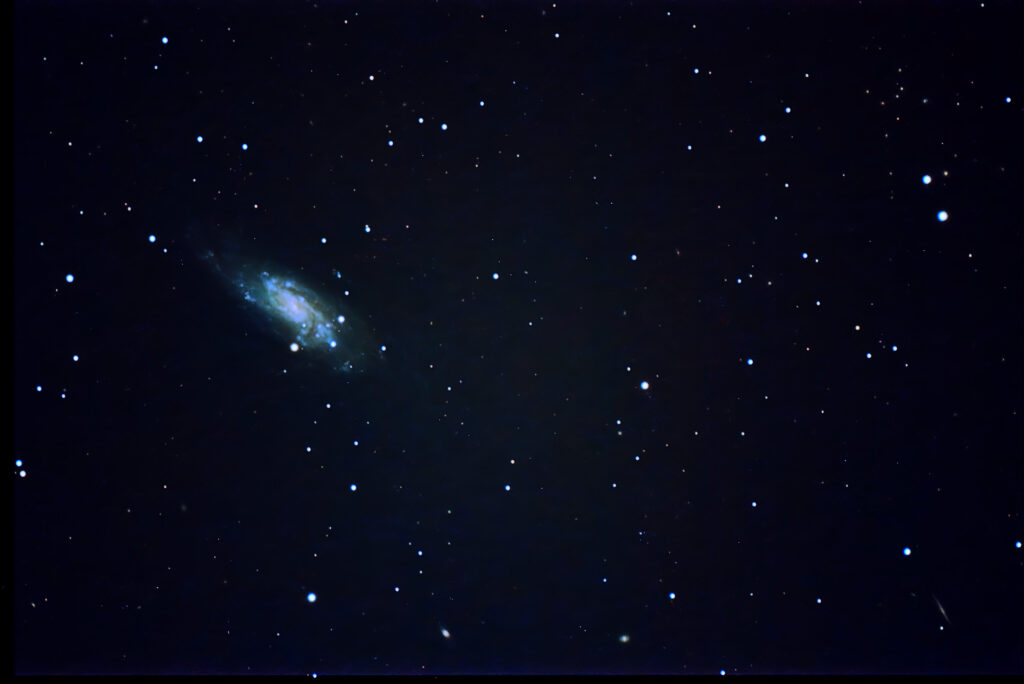 DescriptionDiscovered by William Herschel in 1785, this is an intermediate spiral galaxy, with a bright central core and moderately low brightness disk. It seems to be developing "S" shaped arms, though the closer arm is much heavier than its opposite. There is also a long diagonal arm that cuts across the spiral structure, which strikes me as the result of some sort of interaction with another galaxy. This observation started reasonably clear, but a high cloud layer strengthened over time. There was only a 3-day moon, which was setting, but contributed to the slightly brown gradient. I did my best to reduce it without restricting the view of the galaxy's disk. Ordinarily, I would capture this with a mono-camera on my EdgeHD at f/7. However, the other targets for this evening all required color, so I settled for the 2600mc in bin 2. This is a noticeably slower rig. Yet another William Herschel discovery, this one from 1785.