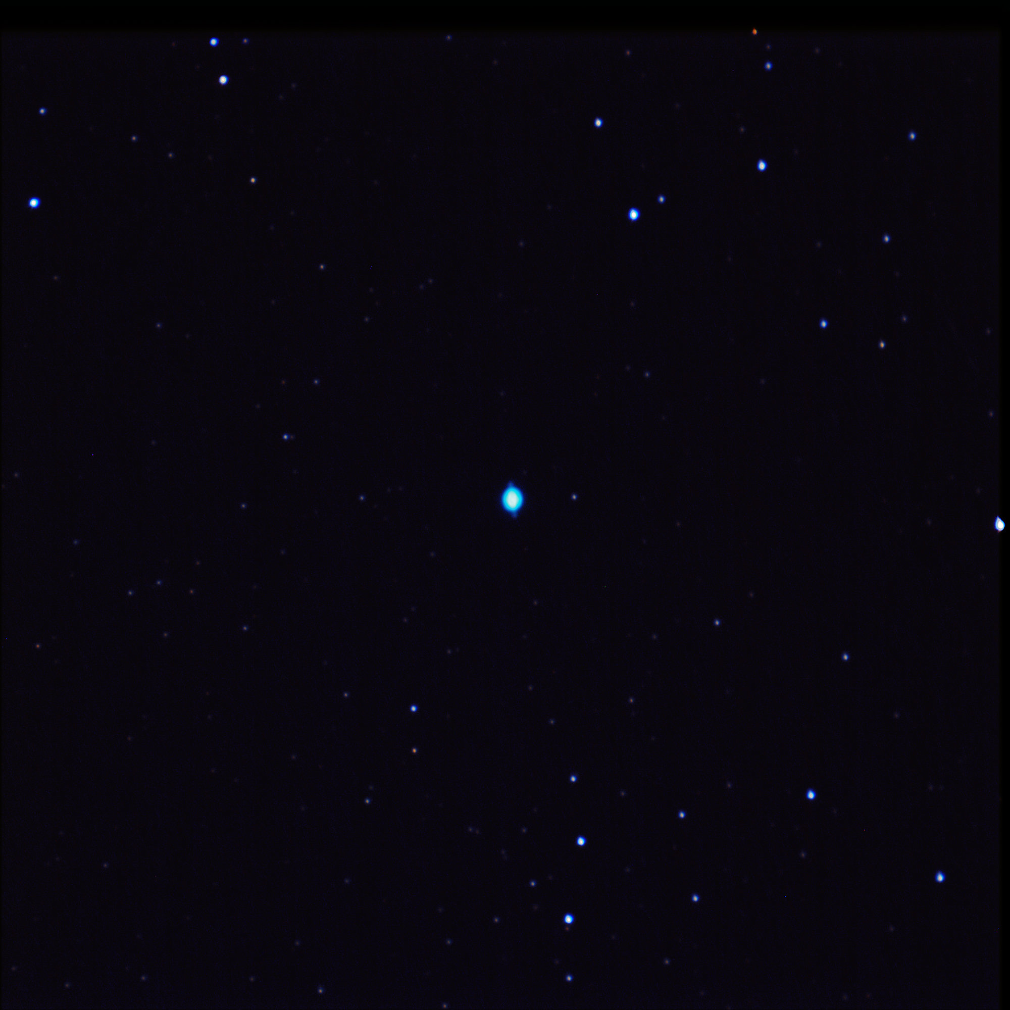 | Description | Discovered by William Herschel in 1782. Lord Rosse discovered the little wings that make this resemble Saturn viewed edge-on. Rosse was the same astronomer who first described spiral nebulae... with M51. Lord Rosse's telescope, nicknamed the Leviathan of Parsonstown, was a reflecting telescope completed in 1845 with a 72-inch mirror and a 54-foot (16.5 m) long tube. Wikipedia says it remained the largest telescope in the world until usurped by the 100" Lick Telescope on Mt. Wilson which opened in 1917. Well, the Hale-designed 60" on Mt Wilson opened in 1908 so that's a more likely usurper in my book. I find small planetary nebula difficult to capture. These objects are so bright you have to really cut back on the exposure. Here 5s at 101g... where with most DSOs I'm shooting 20s@250g. Captured on the same observing session as the Blue Snowball Nebula, this was not a terribly good night with a quarter moon, and clouds coming in and out. I tried staying on this as long as I could, hoping for some center detail to emerge, but clouds ended this capture prematurely. |