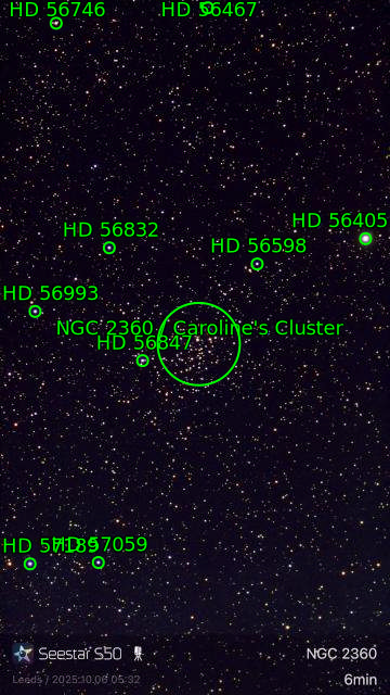 | Description | Caroline Herschel is a hero. Overshadowed by her brother William, she recorded the family's discoveries carefully. Her records did need to be cleaned up by the NGC, roughly 100 years later, but very few observations were lost. This is a handsome, open cluster, and the first one Caroline ever discovered (indeed, her first DSO of any kind). Somehow she had a penchant for discovering some of the most beautiful open clusters in the canon: Caroline's Rose is another favorite of mine. At Dec -15.6 I can't observe this target from my pier, even though it reaches elevations in the mid-20°'s. However, it's straight forward from my deck using the Seestar as it's about 50' further from the southern trees, and a dozen feet higher elevation than the pier. |