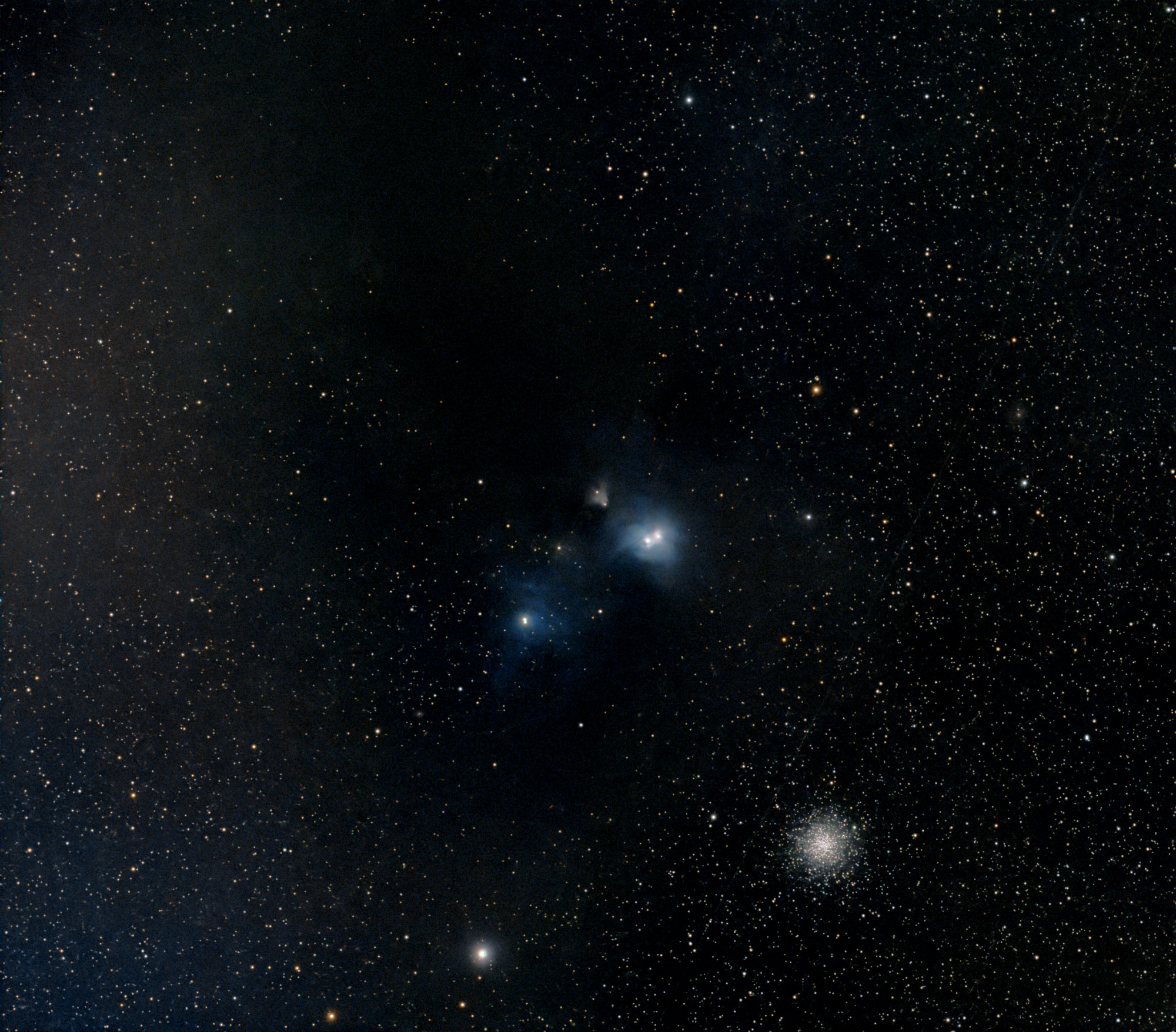| Description | I traveled to Lake Taghkanic "dark site" in order to attempt this target, which peaked at transit at 8:02 PM at 10.7° elevation. This was the evening of the MHAA monthly star party, and I figured I could sneak it in over its low Southern Horizon. I didn't realize that there's a substantial light dome in that direction, affecting the sky below 20°. Nor did I expect to have an audience of about 10 people peppering me with questions. I don't have any appropriate light pollution filters. In the original SharpCap capture, the sky appeared as a light, muddy-brown color with just the barest hint of blue reflection nebula. Considering the handicaps and limited integration time, this is a remarkable image. It was re-stretched using the linear stack saved by SharpCap to produce a processed .tiff with help from a friend who owns Pixinsight. I then finished it in Affinity Photo using two James Ritson macros to brighten the blue nebulosity. |