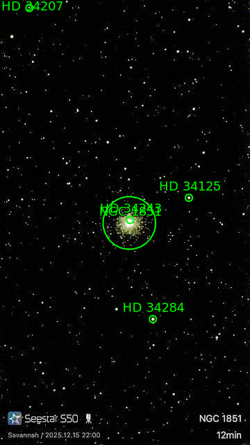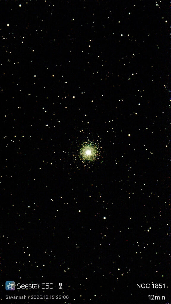 | Description | This is one of a number of southern Caldwell objects discovered by Scottish astronomer James Dunlop. He observed from Parramatta, New South Wales, Australia, between 1823 and 1827, creating one of the first catalogues of southern nebulae, clusters, and double stars. NGC 1851 was discovered in 1826. My image was captured from just outside of Tybee Island, near Savannah, GA, on a recent visit designed to allow me to image a number of southern Caldwell targets (further south than C68). |