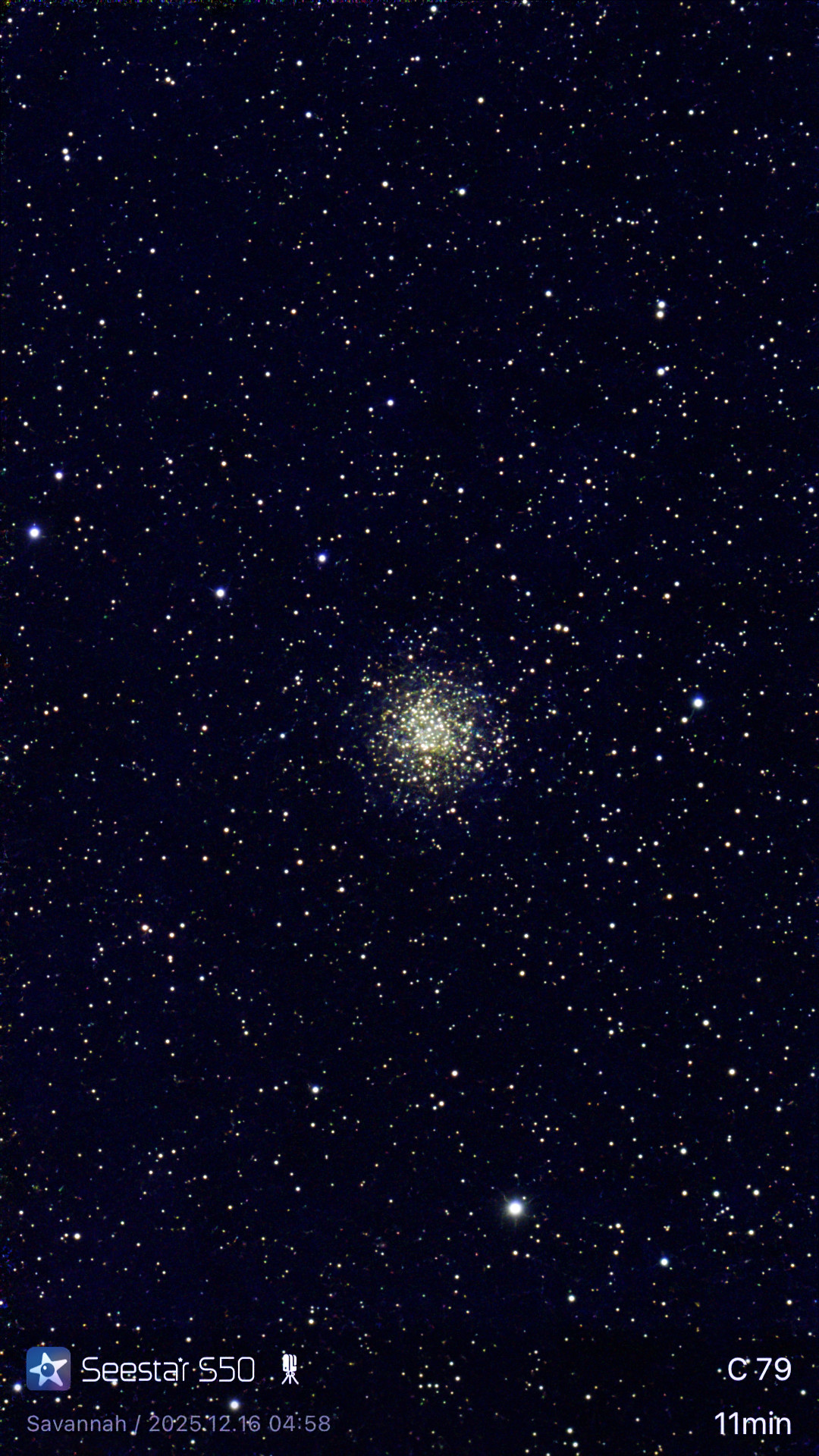 Image DetailsUp is 3.6 degrees E of N. Transparency: Good. Seeing: Good. Total integration time was 11m. Exposures 10s. Standard Seestar enhancement including darks.