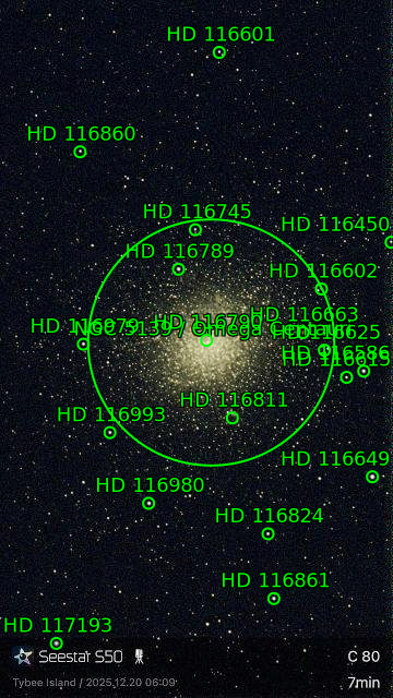 DescriptionOmega Centauri is the largest globular cluster in the sky. It was first identified as a non-stellar object by Edmond Halley in 1677, though it was catalogued as a star (with the naked eye) by Ptolemy. Captured from the boardwalk for 13th St beach access on Tybee Island (near Savannah) just before heading out to the airport. I had to cut short the capture because a red sky presaging dawn was arcing towards the SE, and I figured more integration would reduce quality rather than improve it.