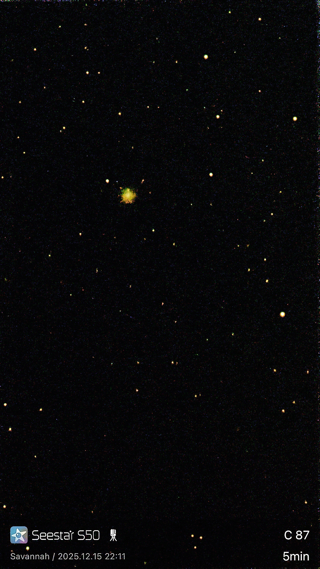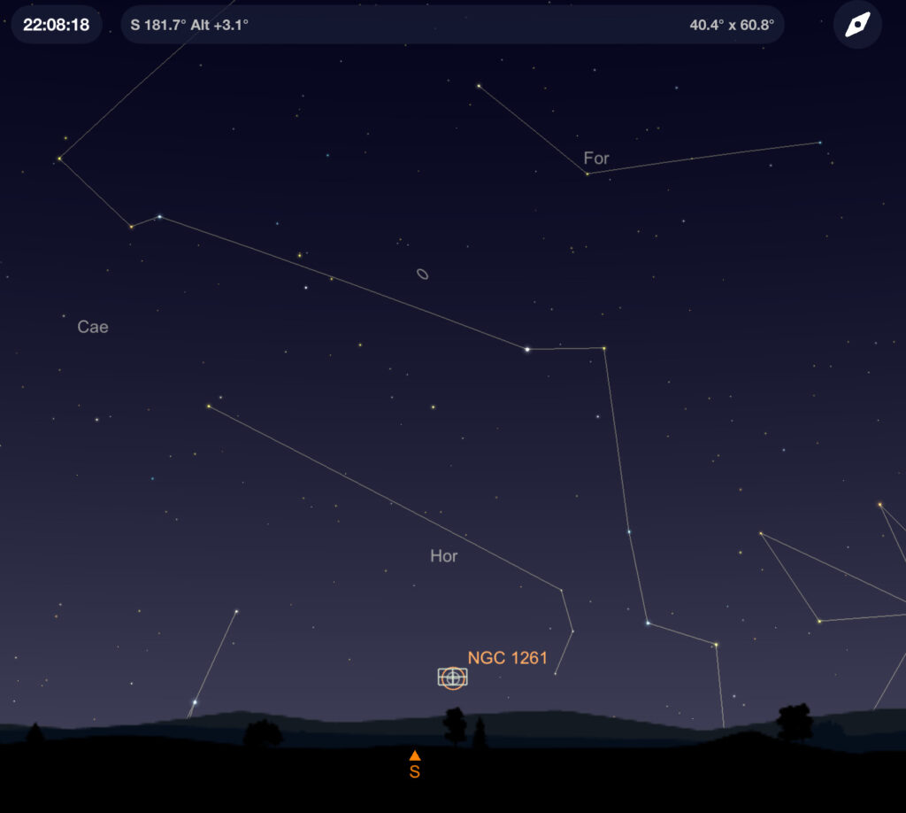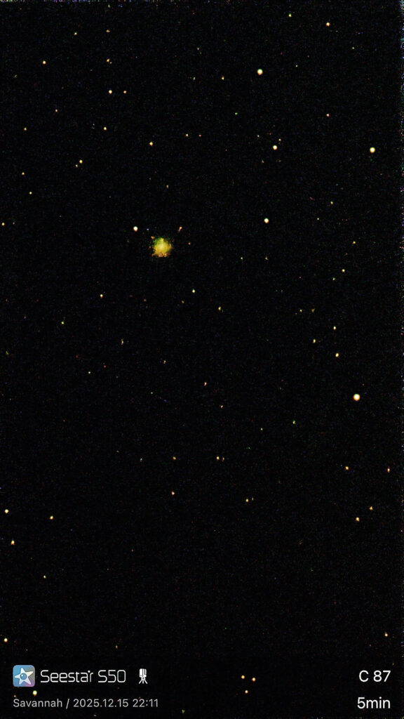| Description | This is another James Dunlop discovery, and the most southern target I've succeeded in capturing (barely) at 3.1% elevation. I was imaging over a marsh, so had nearly 100% horizon. This was captured just past transit, but so low that the Seestar plate-solving failed, which is why the target appears off-center in the full frame (see gallery). Most of what my image shows is the bright core of the GC... along with a small amount of the body, turned green by the atmosphere. Captured from just outside of Savannah, GA, near Tybee Island, on a recent visit designed to allow me to image a number of southern Caldwell targets (further south than C68). During my planning, I'd hoped to capture 5 Caldwell targets on this trip; all above 10% elevation. In the end I managed 8, with this the lowest. Astronomy.net's plate solving is failing as well, so I can't provide an annotated image or my typical star-map. The one provided was generated in SkySafari 7+ set at the time of capture. |