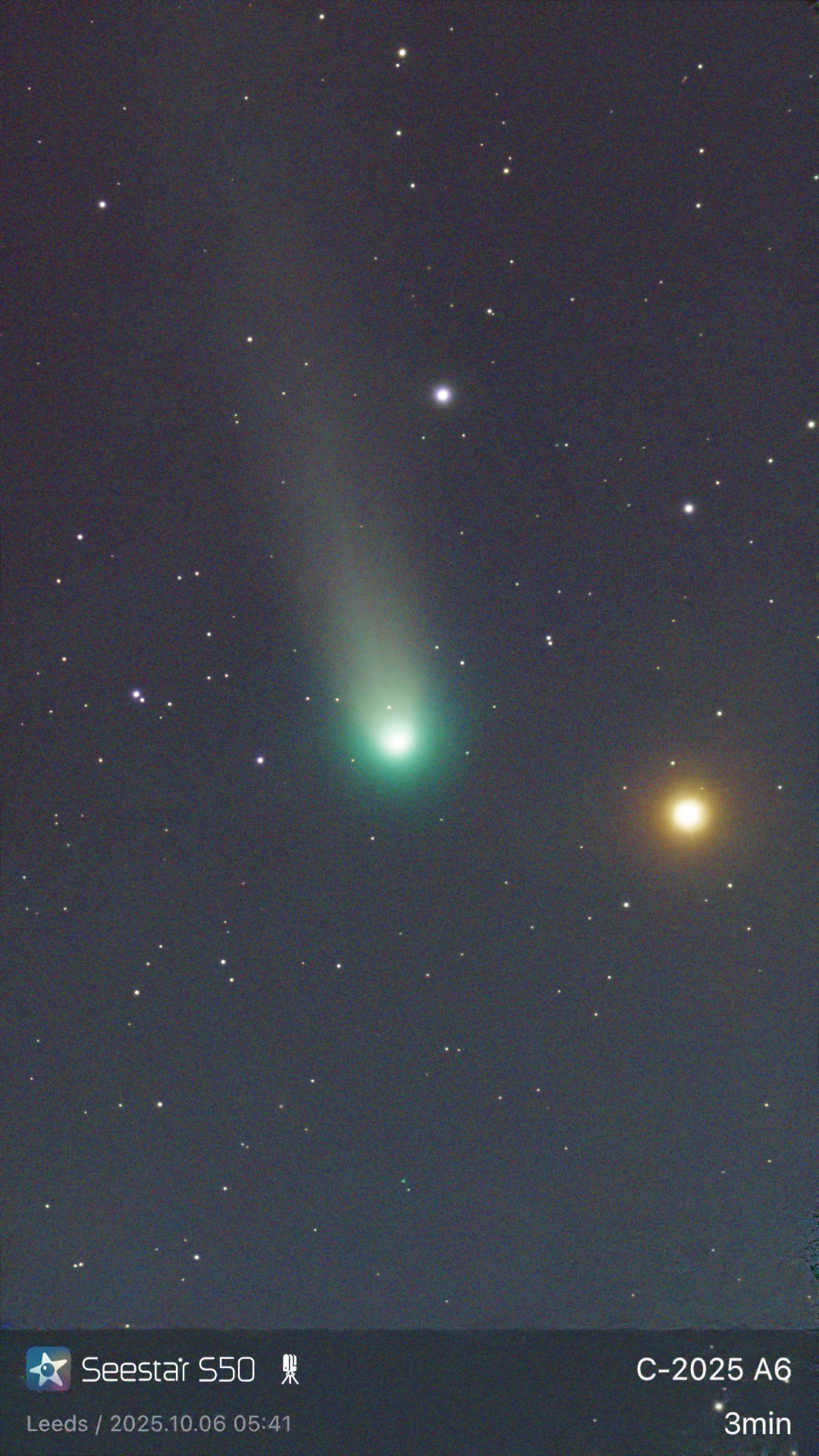 | Description | The comet is obvious, the reddish ball is the 3rd magnitude star Tania Australis (μ UMa 34 UMa), which means it's visible to the naked eye in my arrea. Just before shutting down at 5:30 AM, I checked out the "Comet" section in the Seestar App and found this listing in a readily accessible part of the sky, and allowing me to point directly AWAY from a full moon. This is part of Ursa Major (the big bear, which includes the Big Dipper) which is a "claw" paired with a bright blue star. |