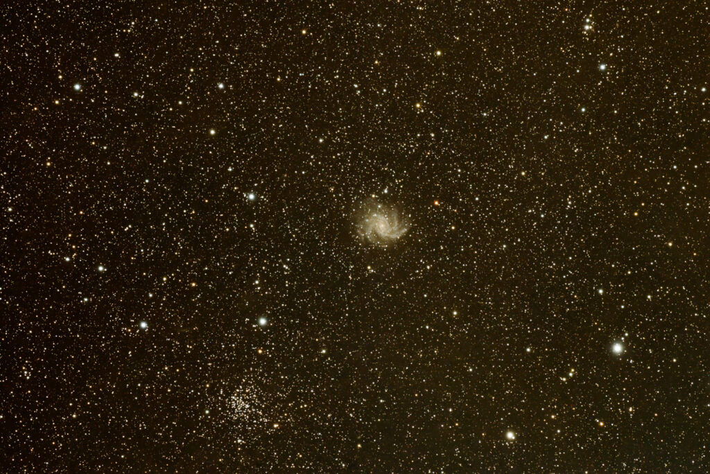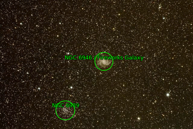 DescriptionPracticing for an upcoming star party with restricted horizons, the Fireworks seemed just the ticket, high in the sky! And so it is. Also, one of my favorites as it was the first galaxy I ever imaged with good results. Added bonus of a reasonably wide view with NGC 6939.
