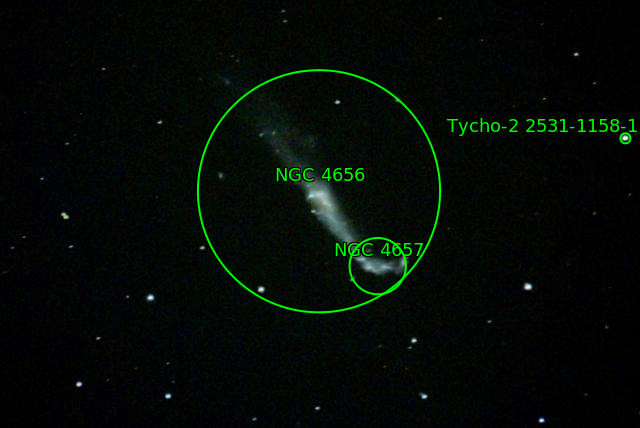 | Description | These two galaxies interact with the "Whale" galaxy: NGC 4631, aka Arp 281. The Hockey Stick is easily deserving of a place in Arp's catalog, though is not included. The faint, upper-left end of the stick is actually a dwarf galaxy in the process of merging end-to-end with 4656. Truly a fun object... I'm hoping to capture a wider field few with both the Hockey Stick and the Whale in the same image. |