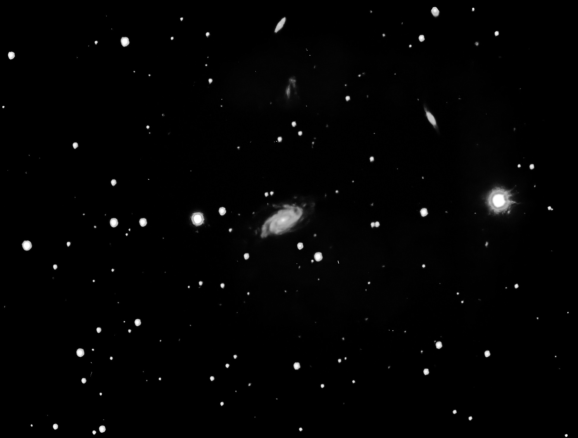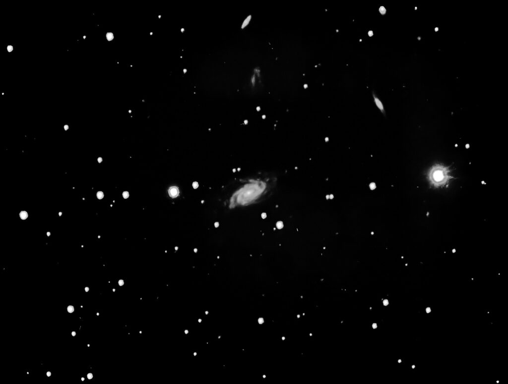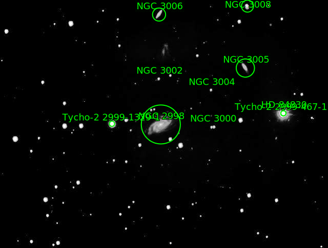 | Description | In researching my Arp talk, I downloaded and read Vera Rubin's classic paper published in 1980 where she measured the rotation curves of 21 spiral galaxies ("Sc" or "Sbc" in the Hubble system) and hypothesized the existence of Dark Matter. She found "Neither high nor low luminosity Sc galaxies have falling rotation curves. Sc galaxies of all luminosities must have significant mass located beyond the optical image." A handsome spiral surrounded by no fewer than 6 other NGC Galaxies: NGC 3000, NGC 3002, NGC 3004, NGC 3005, NGC 3006, NGC 3008 plus a few tiny ones. Unfortunately a pretty mediocre evening for imaging cut short by clouds. |