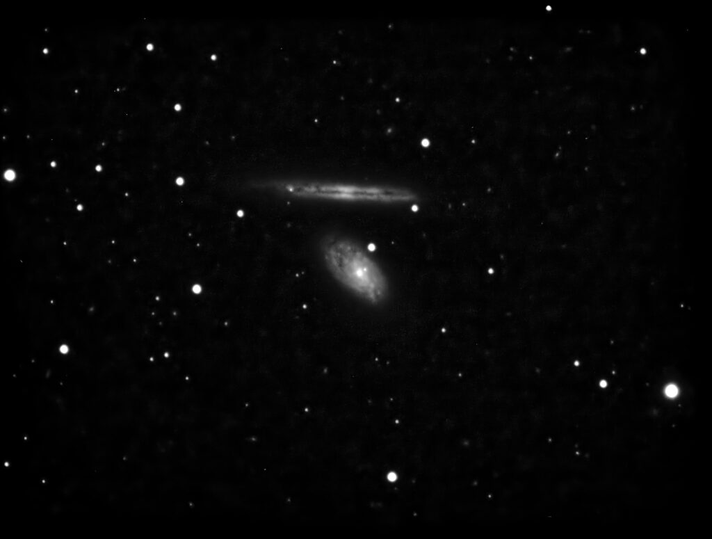 | Description | Yet another discovery by William Herschel on April 8, 1784. NGC 4298 (angling down) and 4302 (edge-on) are both members of the Virgo Cluster. 4298 is classified as a flocculent (meaning "flaky") spiral galaxy, due to its arms being patchy and discontinuous. |