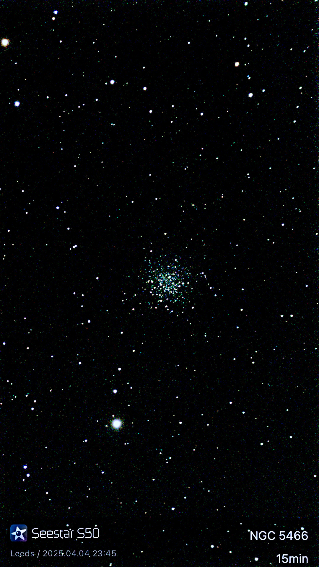 DescriptionA lovely, colorful, relatively dim globular cluster discovered by [who else?] William Herschel on May 17, 1784. It contains something like 97 "blue straggler" stars. I'd never heard of one, but these are blue stars substantially brighter than "main sequence" stars. No one really knows how they are formed, though the leading theory -- because they mostly show up in clusters -- is that they're the result of forced mergers by neighboring stars stimulated by the tight confines of a Globular Cluster. The combined stars end up bigger and bluer than would normally form by themselves. In any event the colors in this cluster are particularly pretty. Caught on a night when I wasn't expecting anything other than clouds... looked outside when getting ready to go to bed and was shocked to see stars.