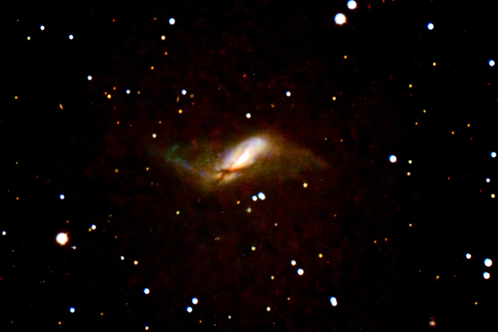 | Description | This was a revisit due to CNN October '25 challenge. I decided to use the 2600 camera in bin 2. A night that started clear and ended mostly cloudy. It took 2.5 hours to capture the 51 minutes. It appears to be a young-ish spiral galaxy that has merged with a much older lenticular galaxy. The two are at different angles, and there is a ring of star-forming regions and dust that appears to completely encircle two galaxies at a roughly 45° angle to the original orientation of the spiral. It's a tough target for an OSC camera, even the 2600. |