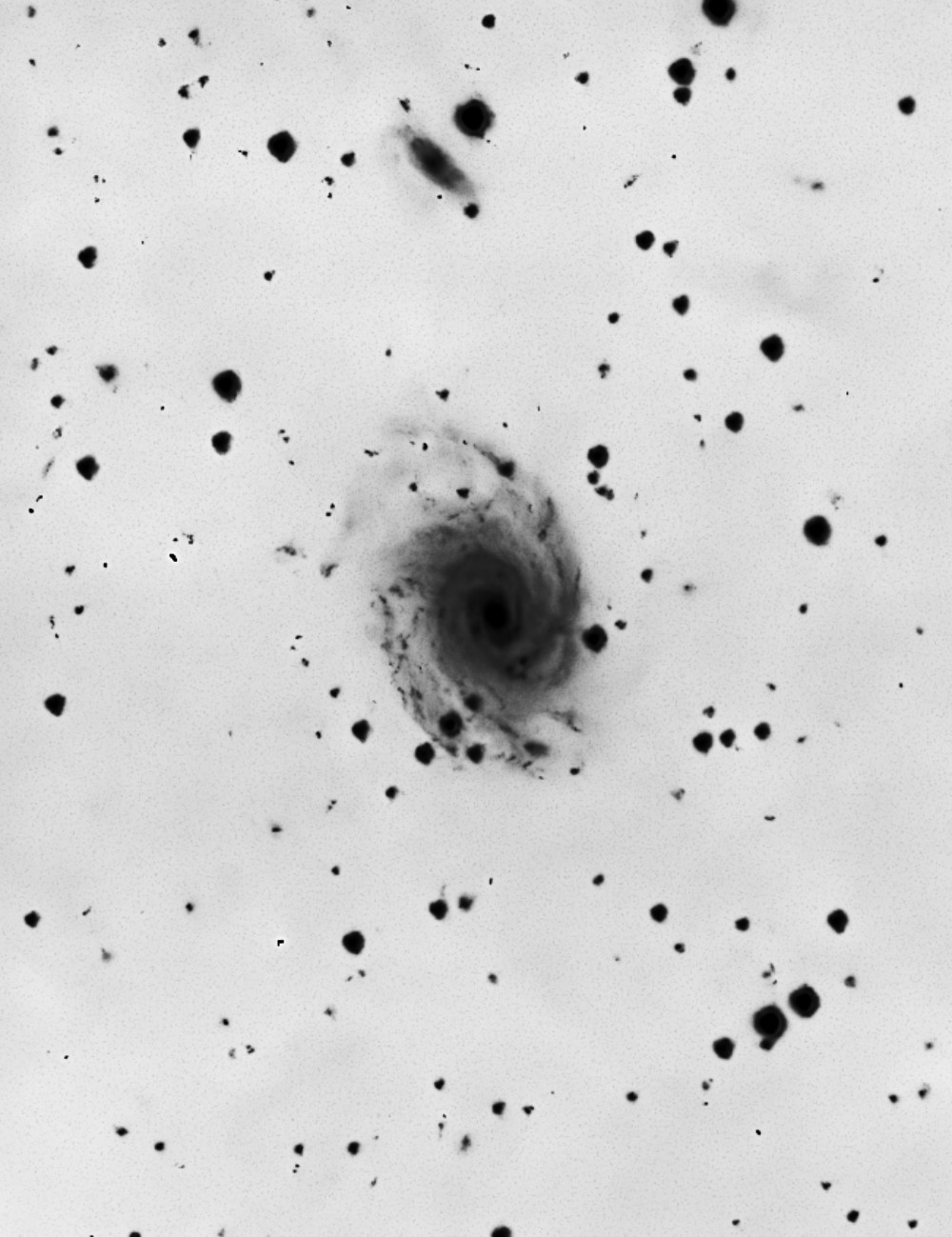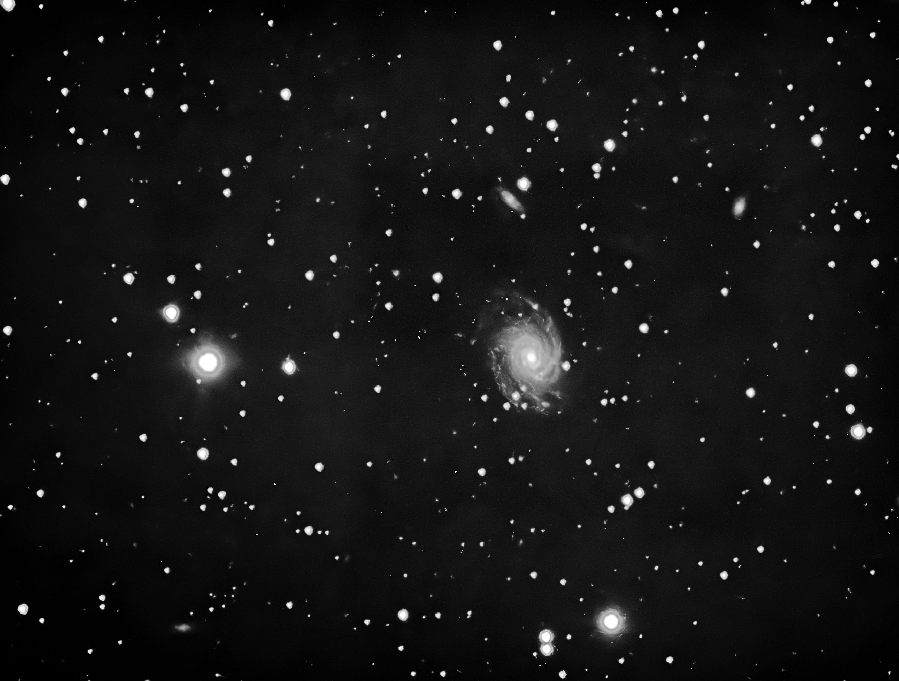 | Description | In researching my Arp talk, I downloaded and read Vera Rubin's classic paper published in 1980 where she measured the rotation curves of 21 spiral galaxies ("Sc" or "Sbc" in the Hubble system) and hypothesized the existence of Dark Matter. She found "Neither high nor low luminosity Sc galaxies have falling rotation curves. Sc galaxies of all luminosities must have significant mass located beyond the optical image." I'd tried to capture this target the night before and failed as high clouds rolled in. Despite being a better night, I was still plagued by clouds rolling in and out. The last 10 minutes of integration time took nearly an hour, and I was anxious to move on. Unfortunately, this didn't allow me to capture the extended, faint arms you see in Vera Rubin's image. Rubin was observing at Kitt Peak Observatory in Arizona, when Geoffrey Burbidge was the Managing Director there. Most of the galaxies were observed using the 2.1 meter telescope there. Of course, a much deeper image than mine. I think this demonstrates the continuing improvement in film emulsions from the mid-1960s to 1979 when this image was captured. |