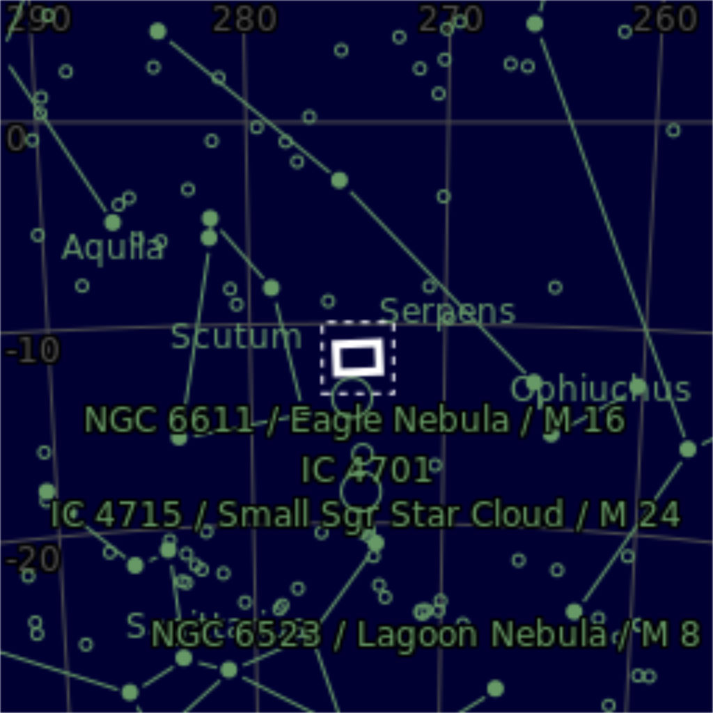 That said, it's a minor part of one of the most active star birthing regions in our part of the Milky Way, incorporating the famous "Eagle" Nebula (M16), which includes the "Pillars of Creation" and the "Swan" or "Omega" Nebula (M17).