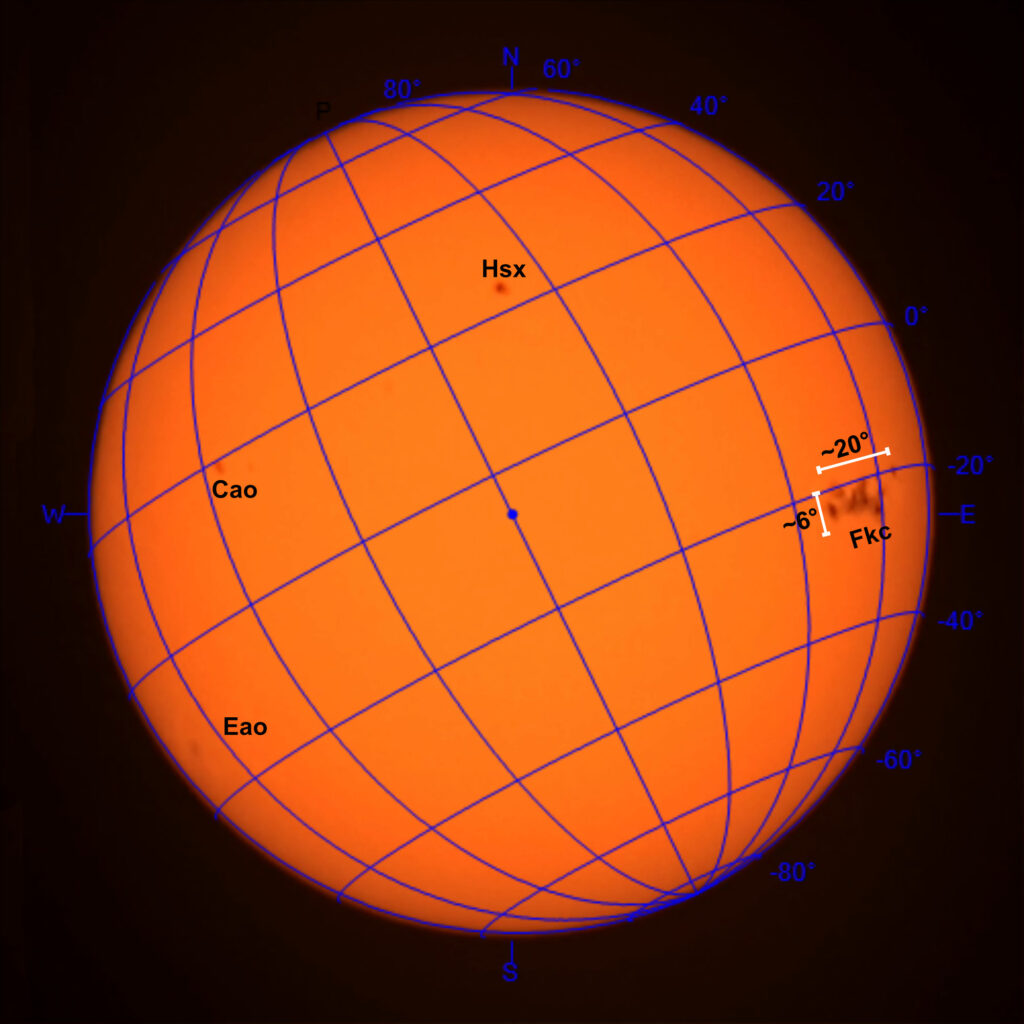 | Image Capture Description | Captured from my back deck on the morning following an Aurora Borealis. Conditions were good with no clouds and relatively stable seeing. Seeing is easy to monitor in the Seestar during solar imaging because the camera sends a continually updated video stream to your phone. Especially if look at the limb, you can readily judge how steady it is. Longitude and latitude lines added by a Freeware Windows program called Helio Viewer. |